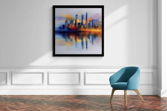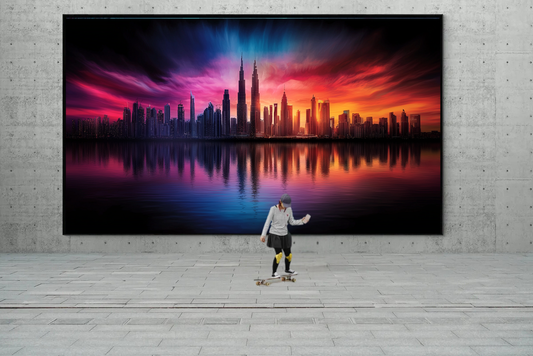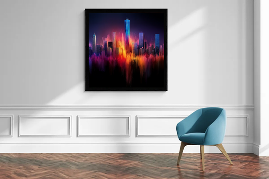 „Flammen der Stadt“ – Moderne Skyline in leuchtenden Farbexplosionen