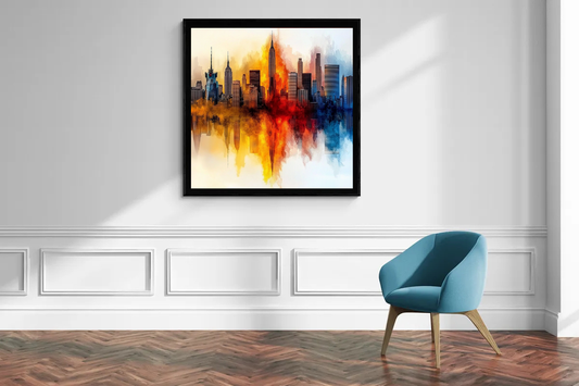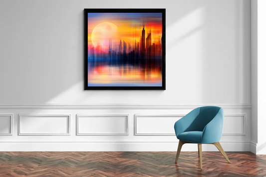„Stadt in Flammen“ – Abstrakte Skyline in lebhaften Farbexplosionen