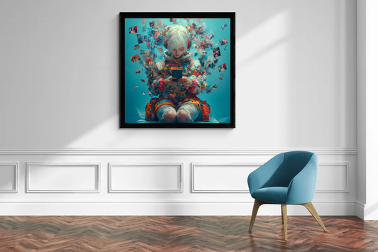 „Digitale Träume“ – Moderner Kunstdruck im Tech-Pop-Stil mit nachdenklicher Botschaft
