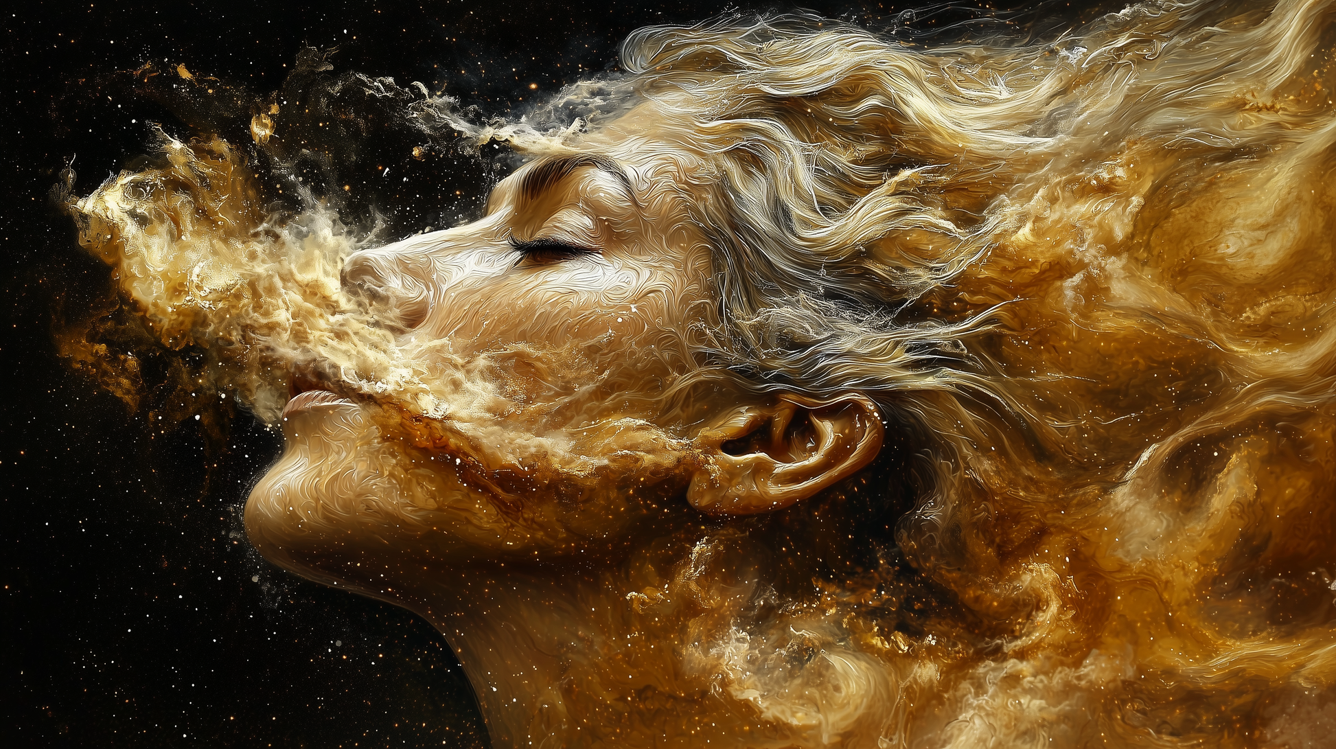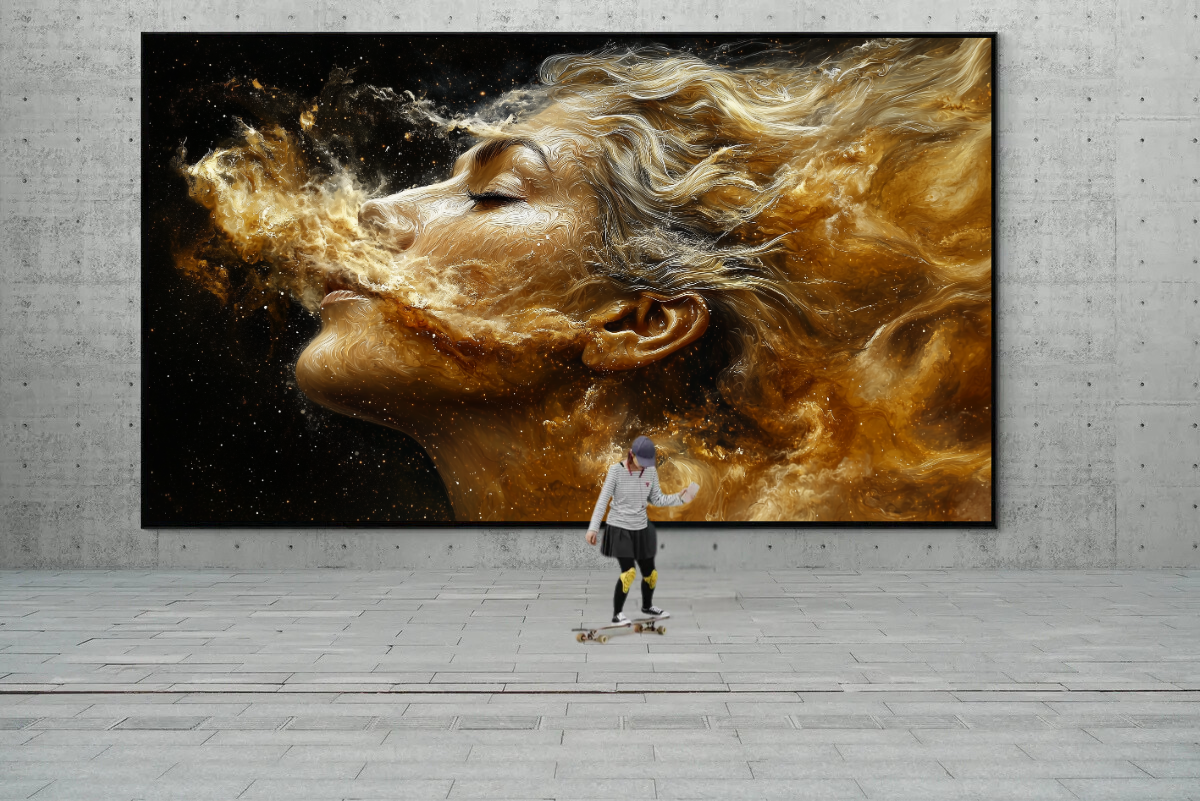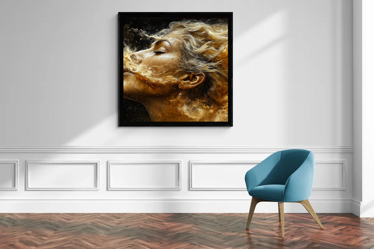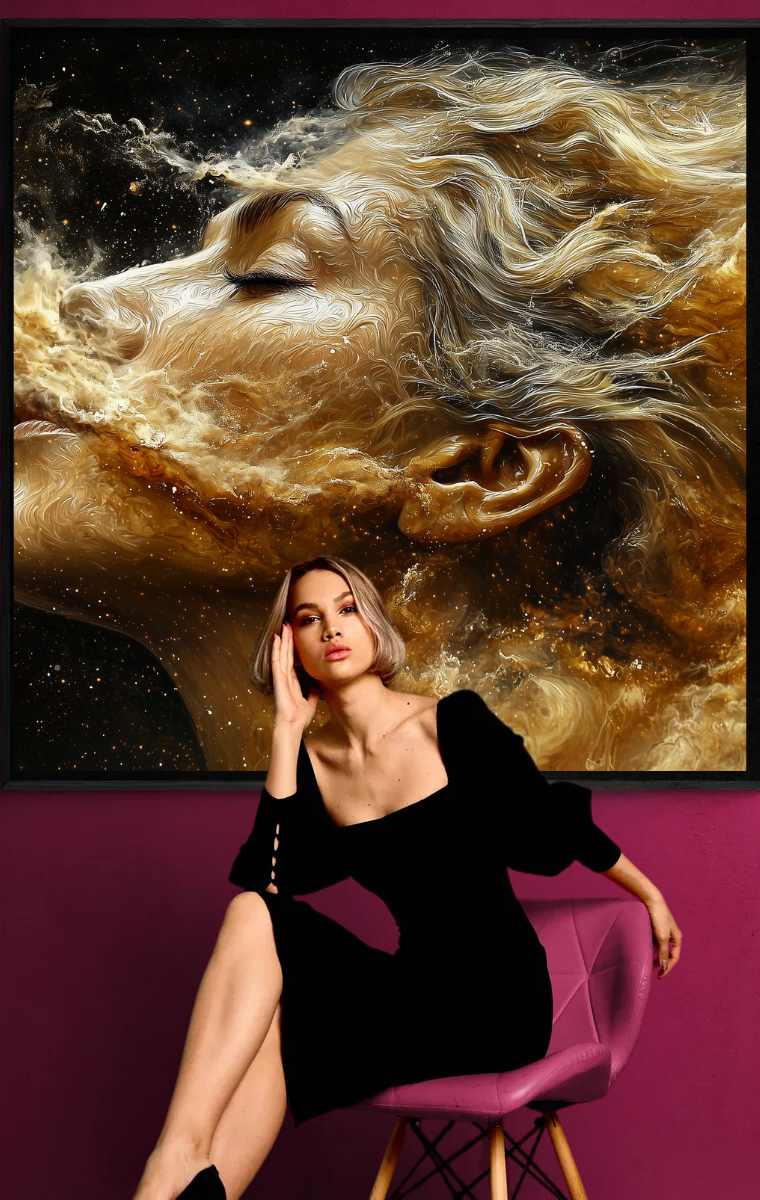 Breath of the Universe is a hypnotic work of art that captures the essence of life and space in a single movement. The combination of human form and cosmic energy symbolizes the deep connection between the individual and the universe. With its flowing lines and golden accents, this work is a tribute to eternity.