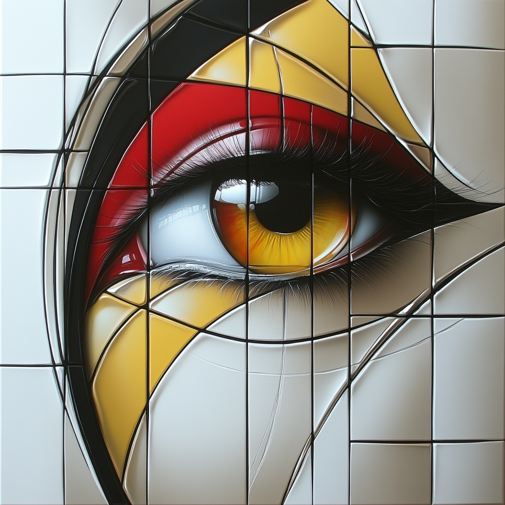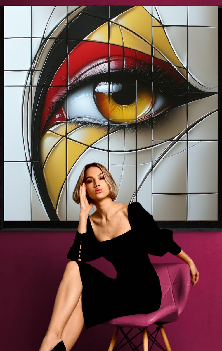 "Gaze of Geometry" is an artistic print that depicts the human eye in a fascinating, geometric way. Inspired by constructivism, this work breaks the image down into a multitude of precise shapes and lines that are brought together to create a harmonious overall image. The bright yellows and reds set powerful accents and draw the focus to the lifelike eye, which is almost hypnotic.