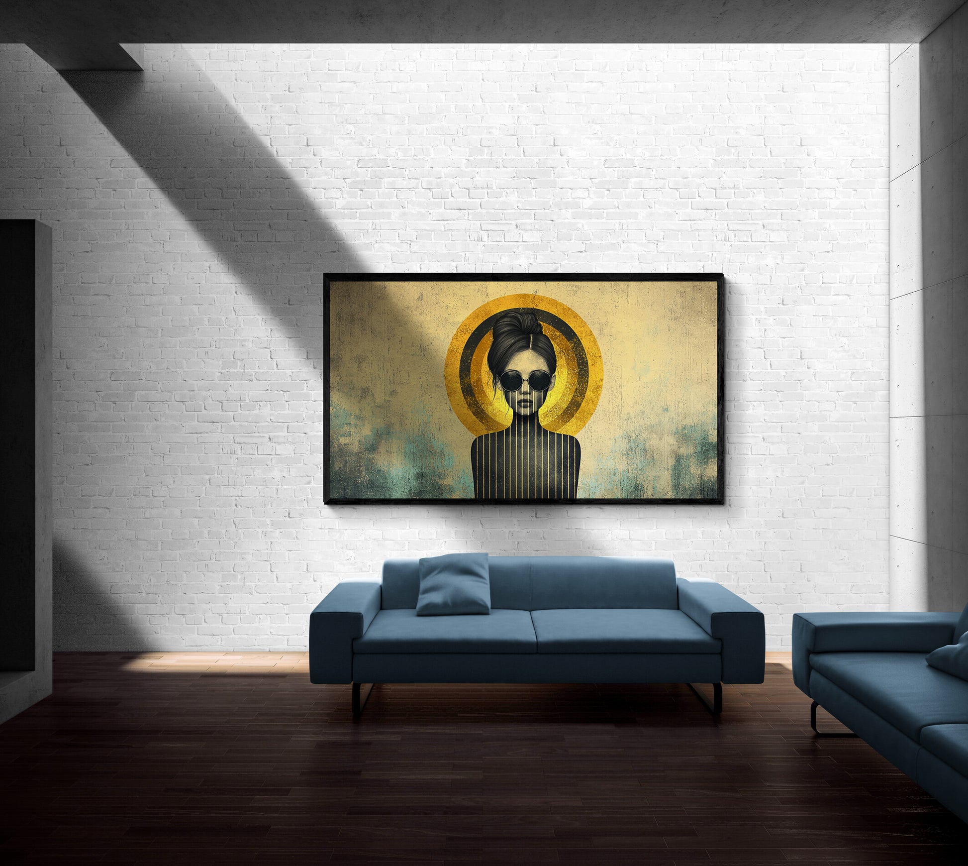 - The Woman Figure: With a sophisticated, stylized profile and bold black sunglasses, this figure embodies a mysterious aura. Her face, surrounded by a shimmering golden halo, exudes calm, while her posture suggests quiet authority.