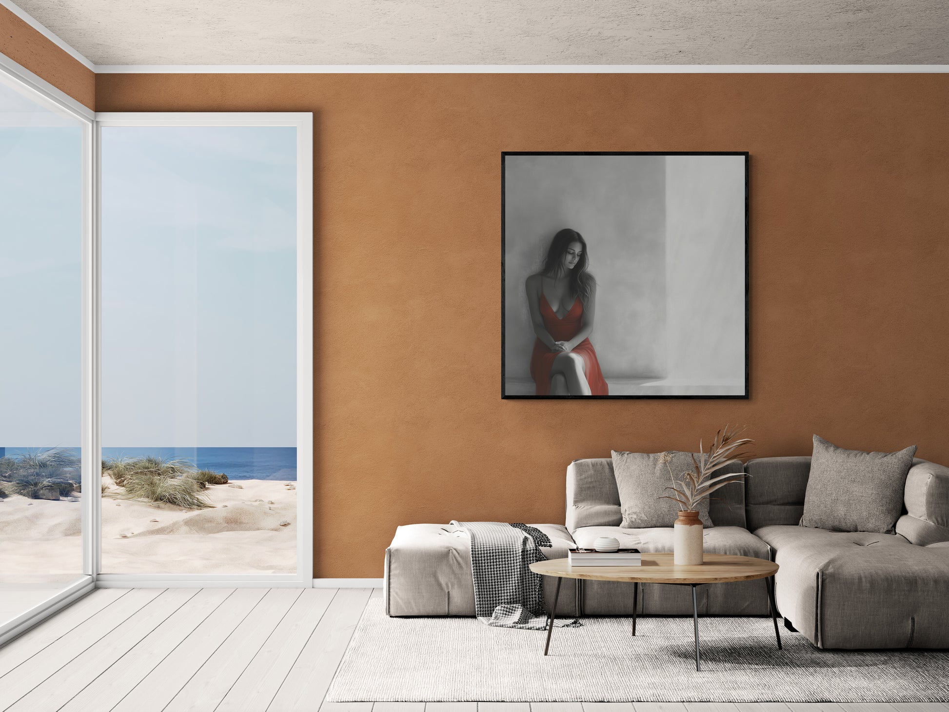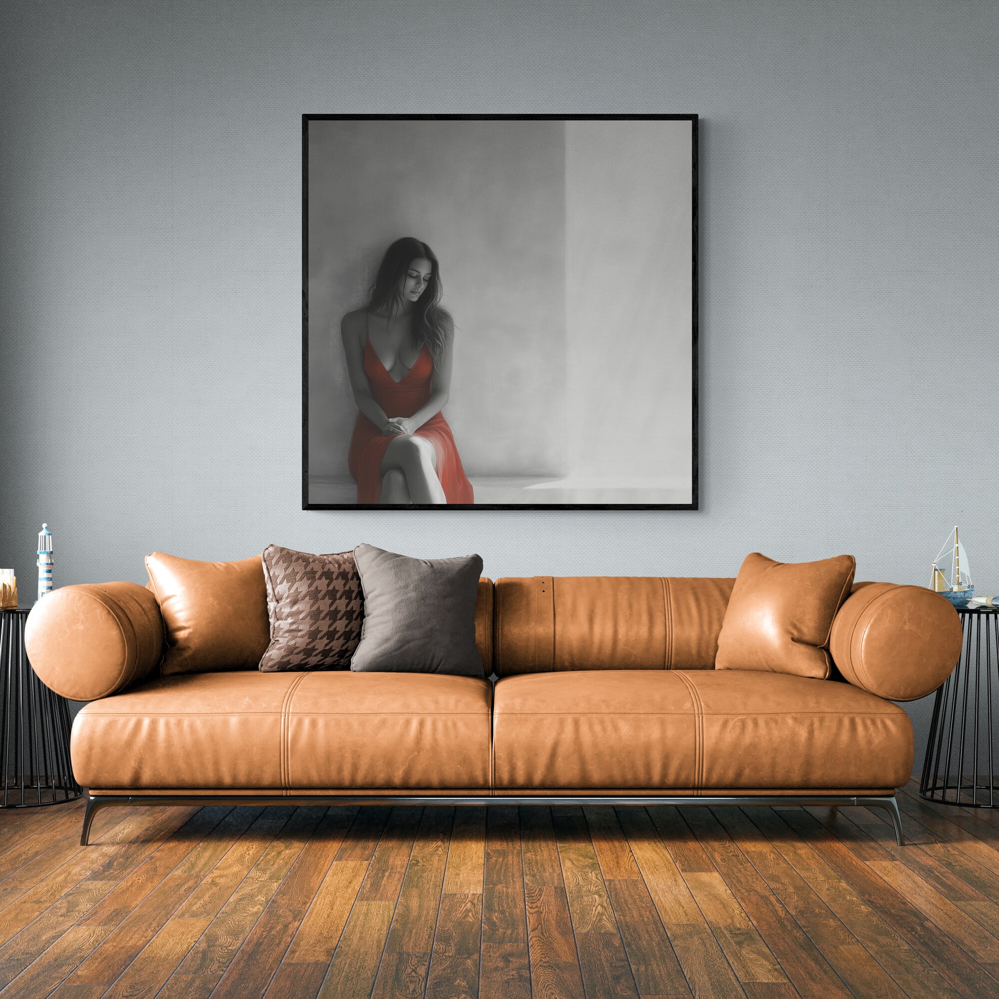 “The Glow of Silence” is a graceful art print motif that, with its restrained color palette and bright red accent dress, creates a haunting mood between thoughtfulness and a promising new beginning. The calm composition and the soft light transport the viewer into a world full of reflection and quiet emotionality.