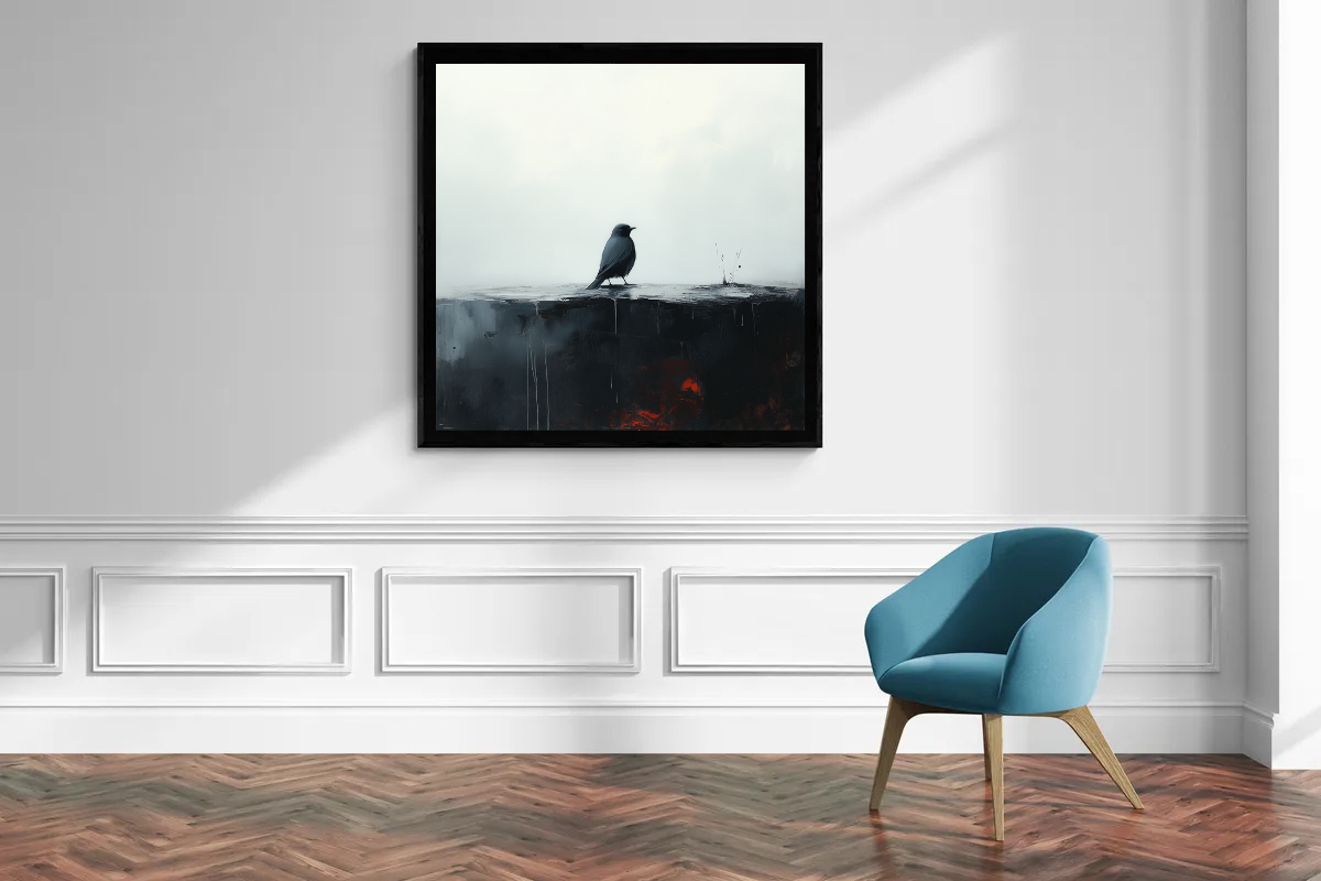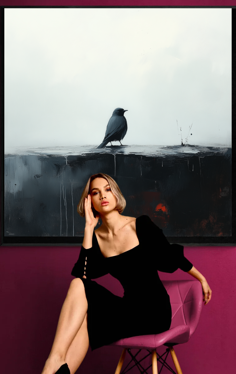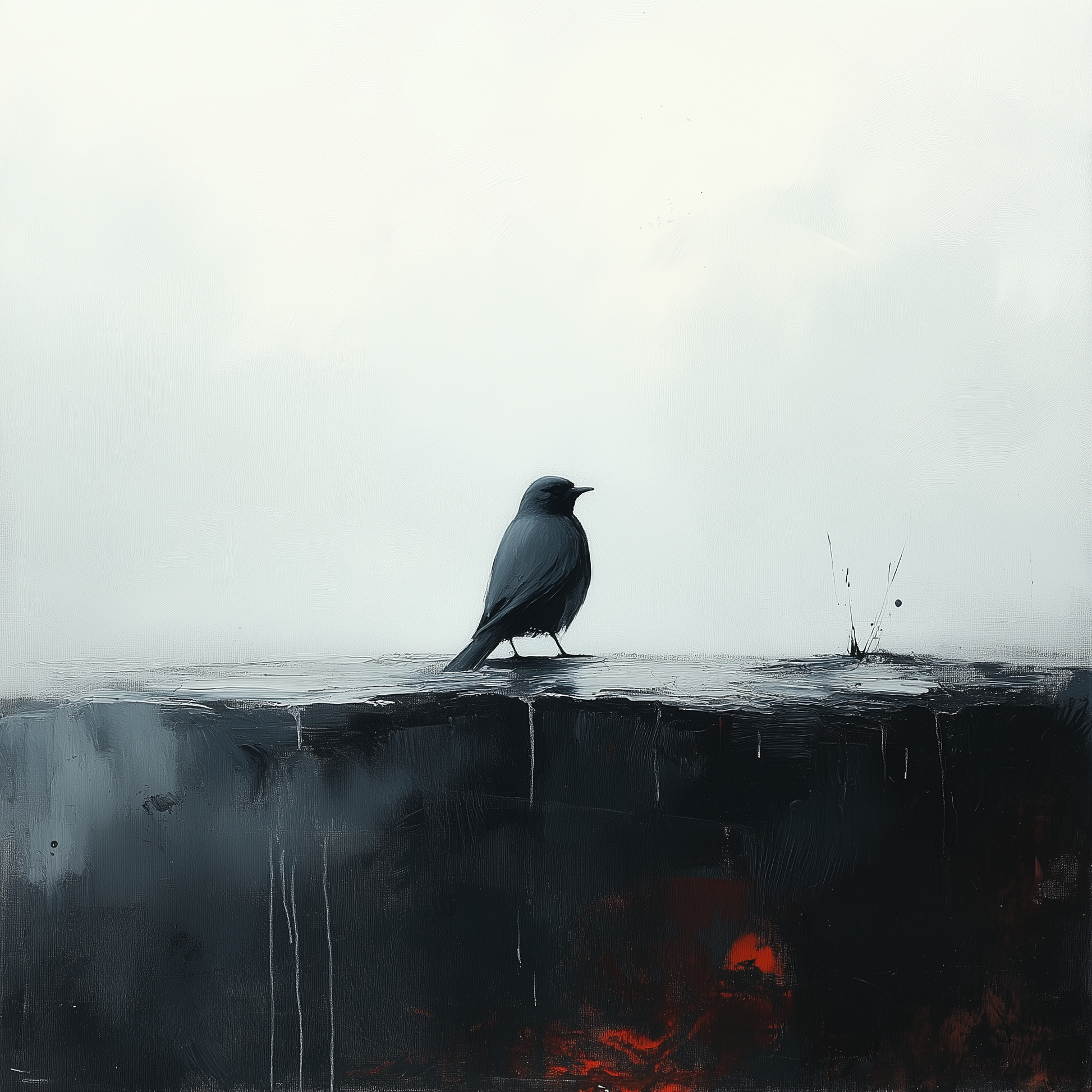 "The Guardian of Silence" is a haunting yet simple work of art that uses reduced elements to create a profound emotional impact. The silent bird resting on a rough, dark platform embodies loneliness, calm, and the silent watch over an unknown, mysterious world.