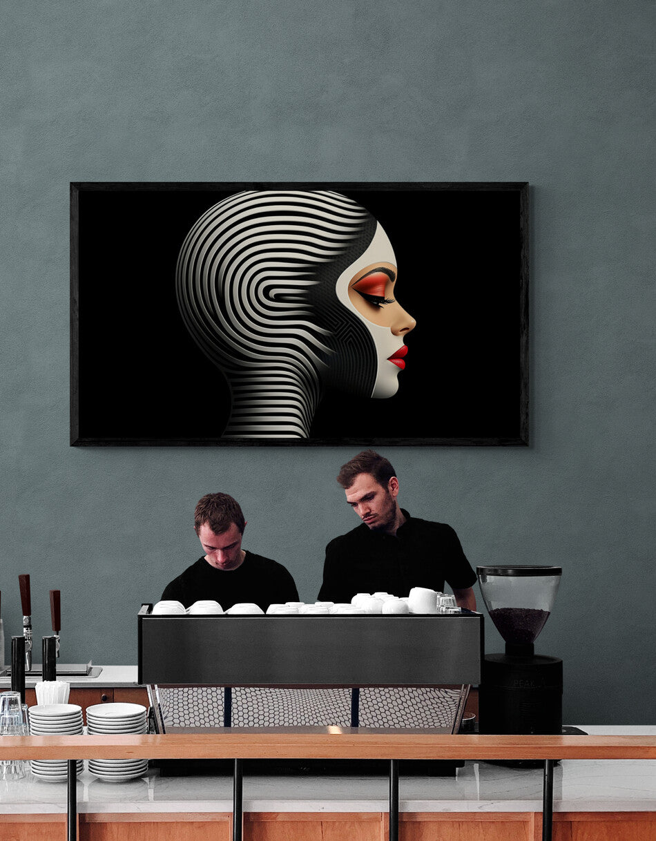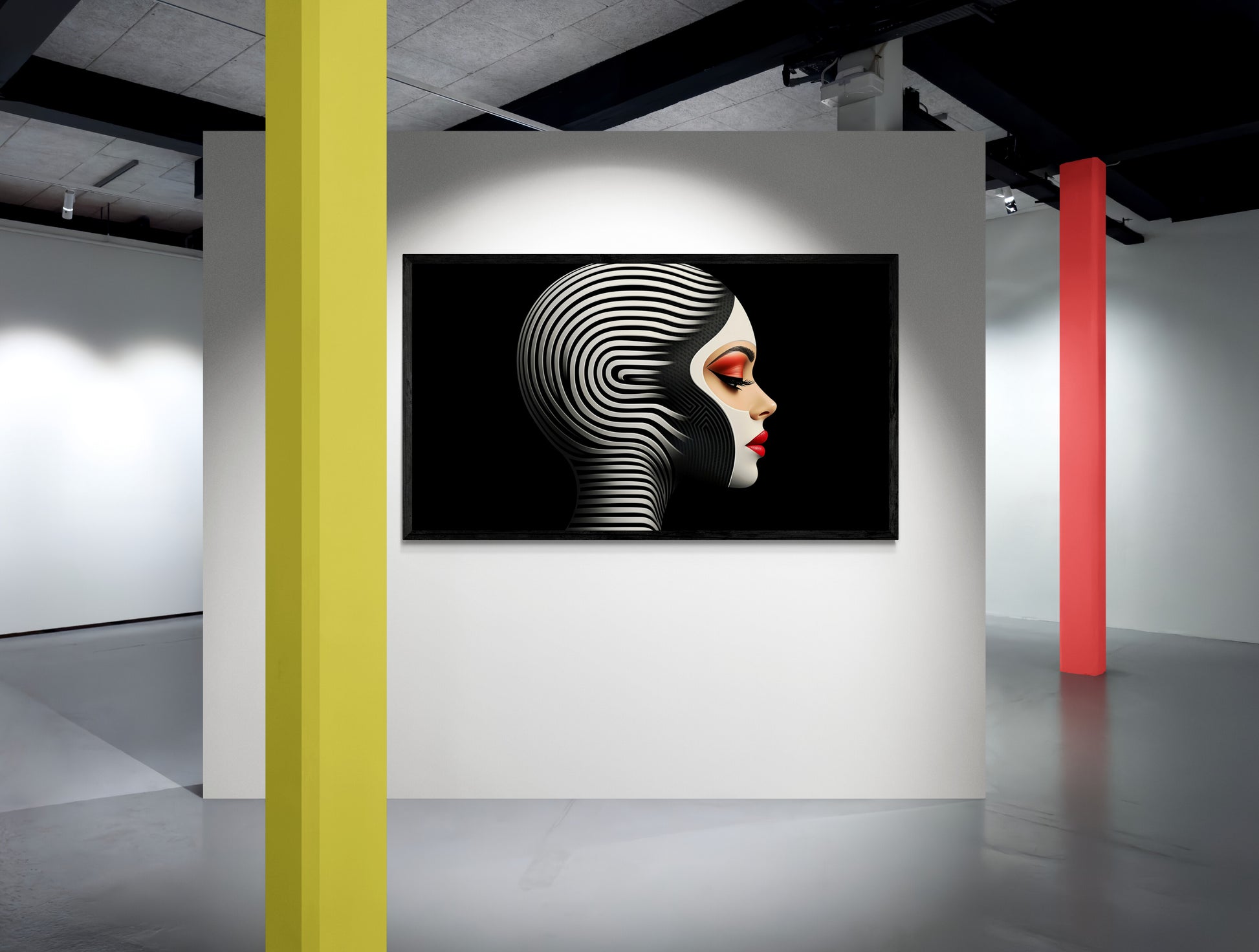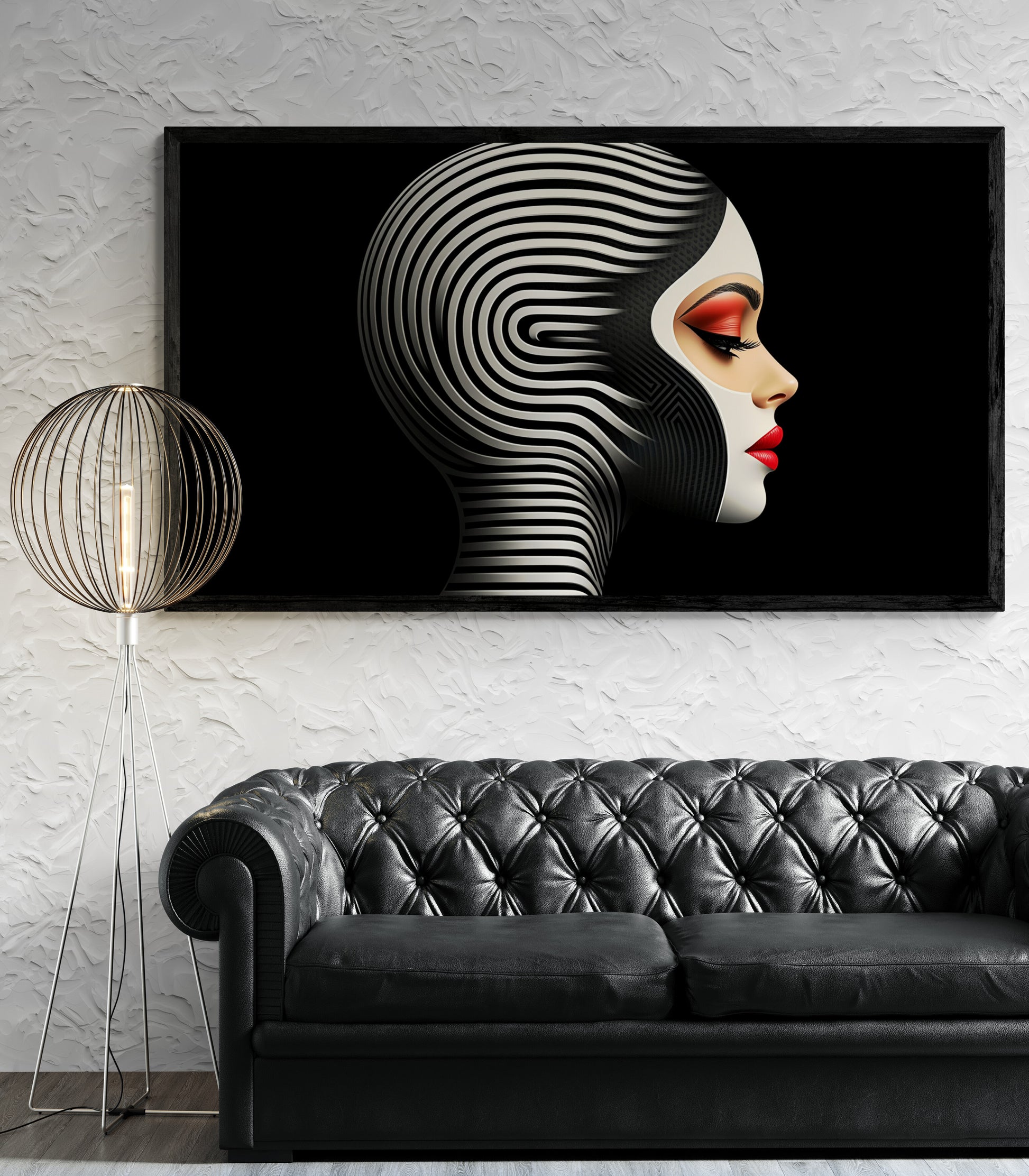 "The Hypnotic Muse" is an art print motif that combines op-art elements and futuristic elegance with its striking black and white lines and bright orange-red accents . The overlapping, curved stripes form a unique facial profile that appears both three-dimensional and mystical and inevitably draws the viewer's gaze.