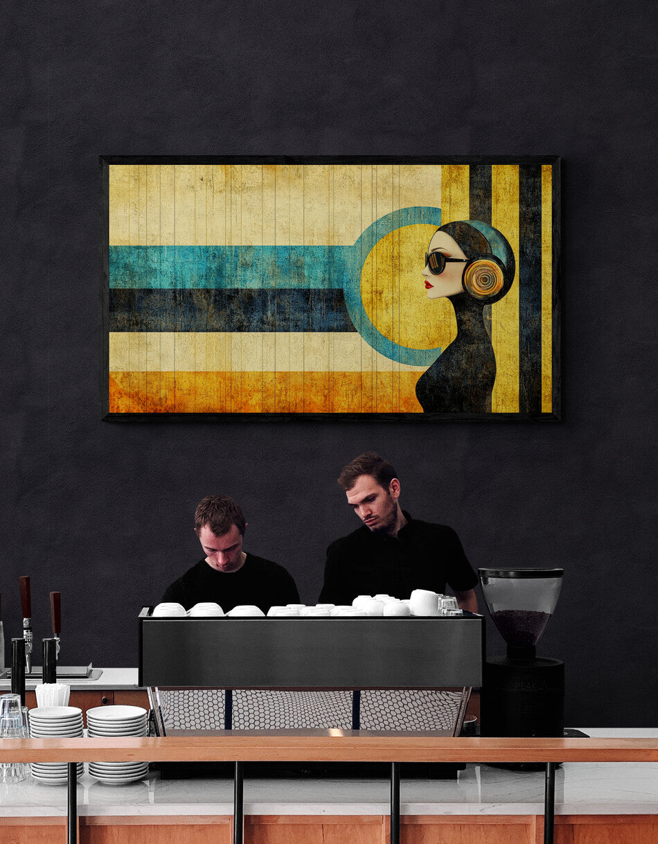 - The headphones: They are a central element of the image and represent the musical world that the woman absorbs. The spiral-shaped ear cups convey a hypnotic, fast trance-like state.