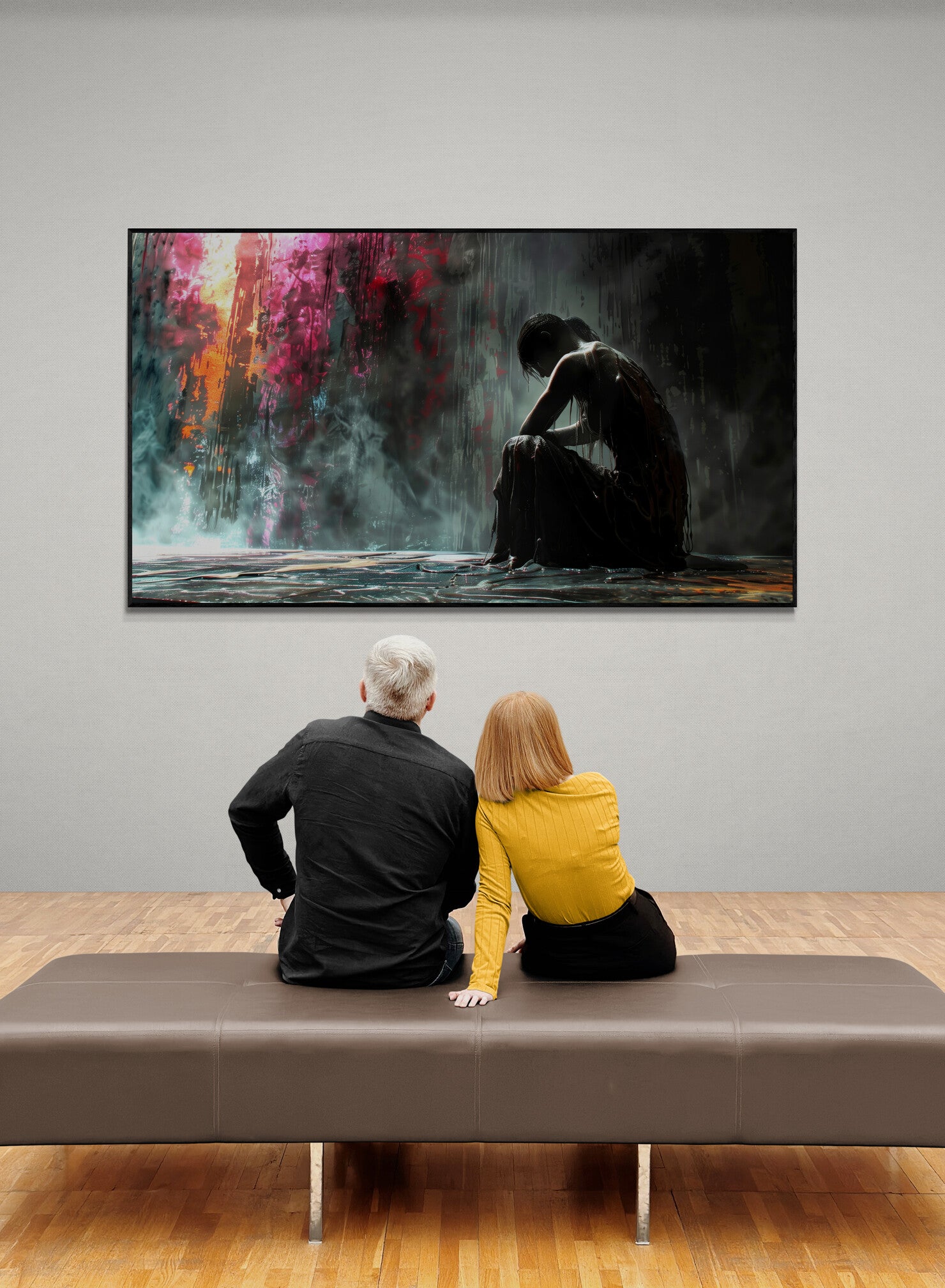 “Tears of Transformation” is an expressive art print that captures the moment of deepest self-reflection in a colorful environment. The contrasting, flowing colors and the powerful silhouette create a dramatic tension between inner conflict and the possibility of blossoming anew in the midst of chaos.
