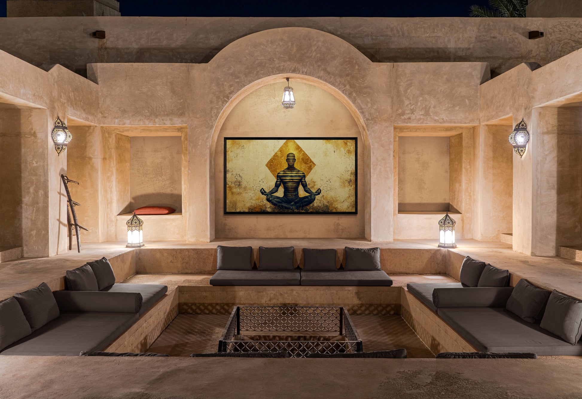 Die Haltung der Figur und ihre Positionierung im Zentrum des Diamanten stehen für Zentrierung, Klarheit und die Suche nach innerem Frieden . Es symbolisiert die Verbindung zwischen Körper, Geist und Seele . -