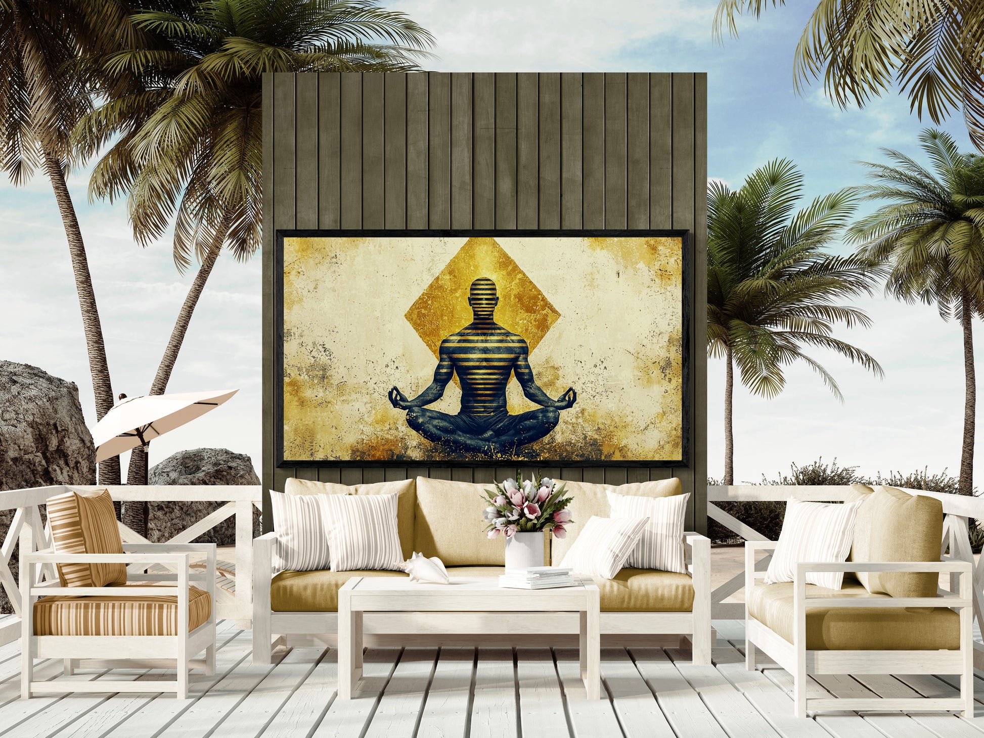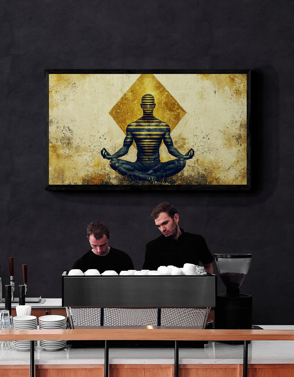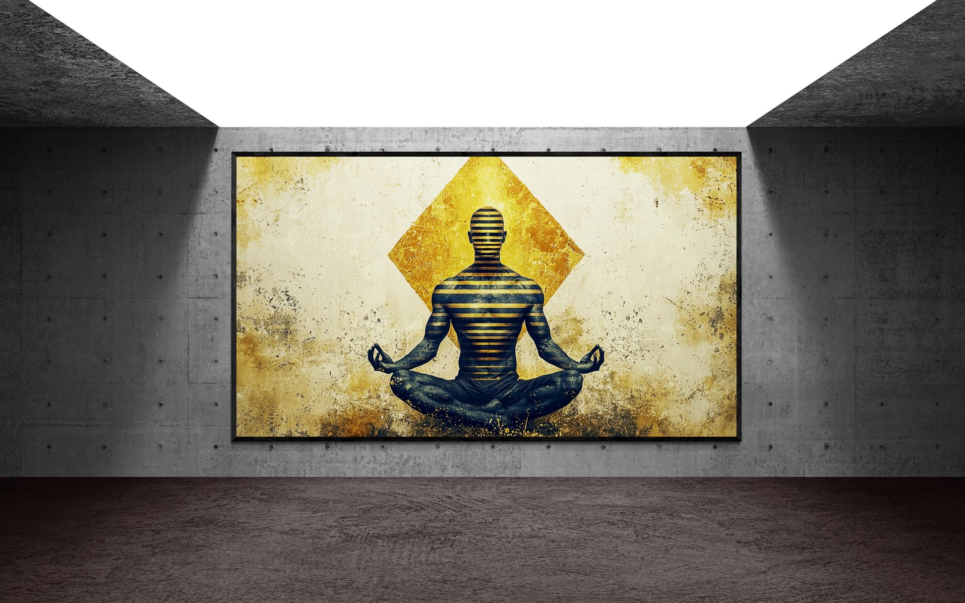 Im Zentrum des Werks sitzt eine stilisierte menschliche Figur in einer Meditationshaltung, vollkommen konzentriert und ausgeglichen. Die horizontalen gold-schwarzen Streifen, die ihre Körper durchziehen, symbolisieren innere Harmonie und den Fluss von Energie durch den Körper . -