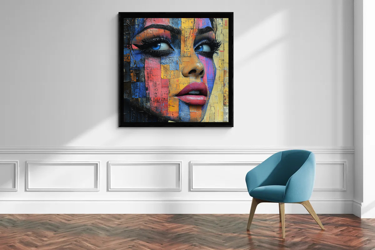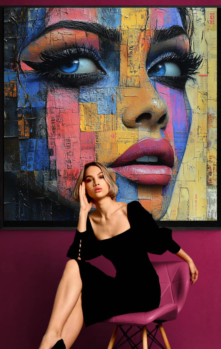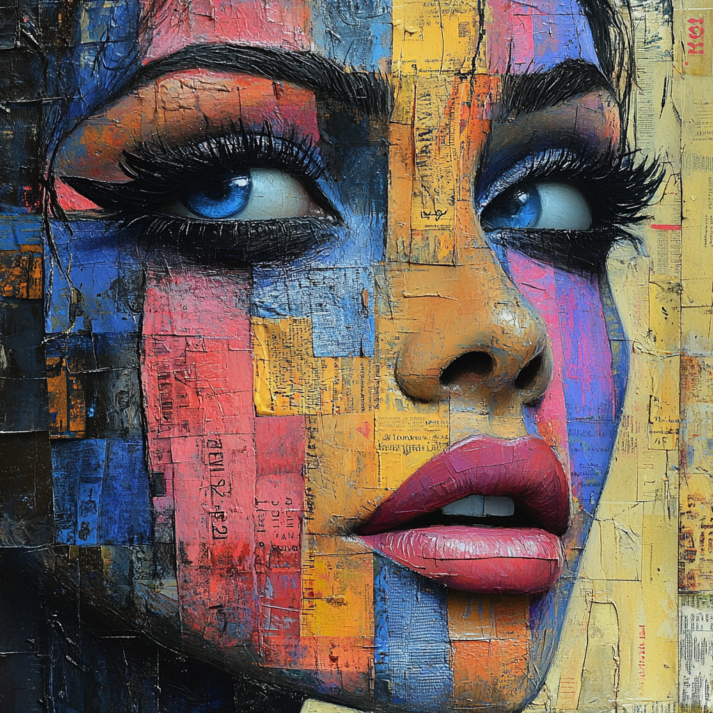 „Blick der Mosaike“ ist ein lebendiges, faszinierendes Porträt, das die traditionelle Kunstform der Mail Art neu interpretiert. Die zarten Details der Gesichtszüge, umrahmt von kräftigen Farben und Texturen, verleihen diesem Werk eine kraftvolle Ausstrahlung. Die Augen, tiefblau und ausdrucksstark, ziehen den Betrachter sofort in den Bann und kontrastieren eindrucksvoll mit den warmen Tönen und Texturen des Hintergrunds.