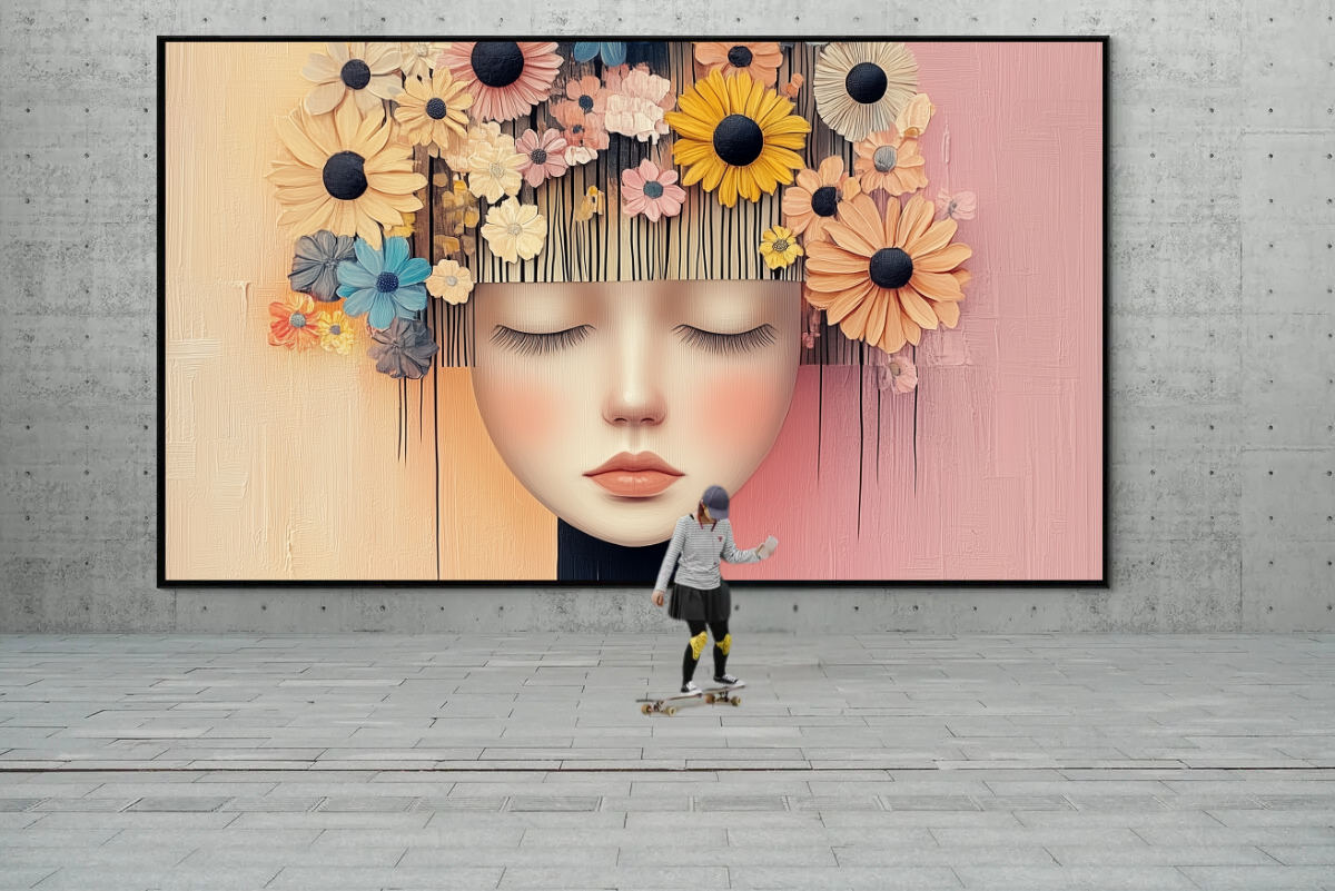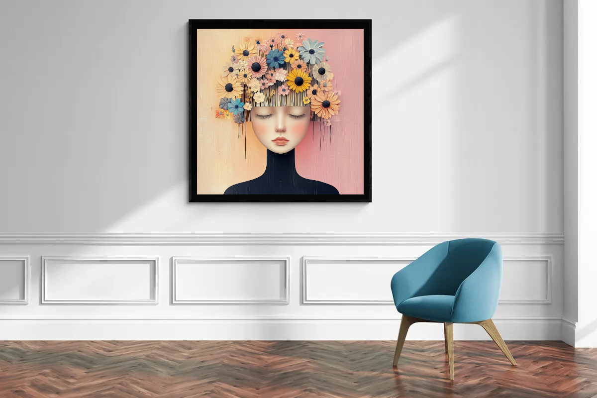Dieses bezaubernde Kunstwerk vereint die Zartheit der Natur mit der Ruhe eines stillen Geistes. „Blüten der Gedanken“ zeigt ein weibliches Gesicht mit geschlossenen Augen, das von einem Blumenmeer gekrönt wird, welches die Grenzen von Fantasie und Realität überschreitet.