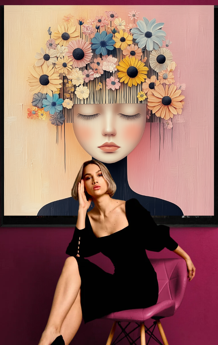- Neutrales Schwarz für den Körper: Lässt das Gesicht und die Blumen im Fokus stehen und unterstreicht die Eleganz des Werkes.
