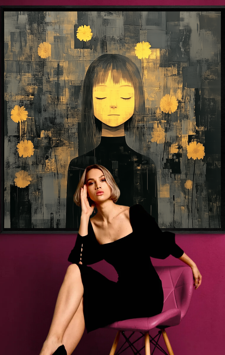 - Schwarz und Grau: Schaffen einen Kontrast, der die Blüten und das Gesicht hervorhebt und zugleich eine tiefe, reflektierende Stimmung vermittelt.