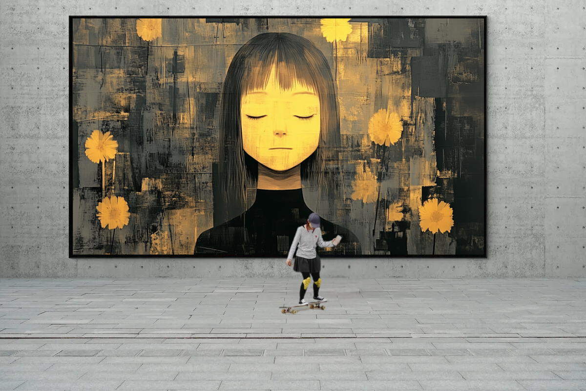 - Das Mädchen mit geschlossenen Augen: Symbolisiert die innere Welt, Selbstreflexion und das Finden von Ruhe in sich selbst. Die geschlossenen Augen laden den Betrachter ein, ebenfalls einen Moment innezuhalten und nach innen zu blicken.