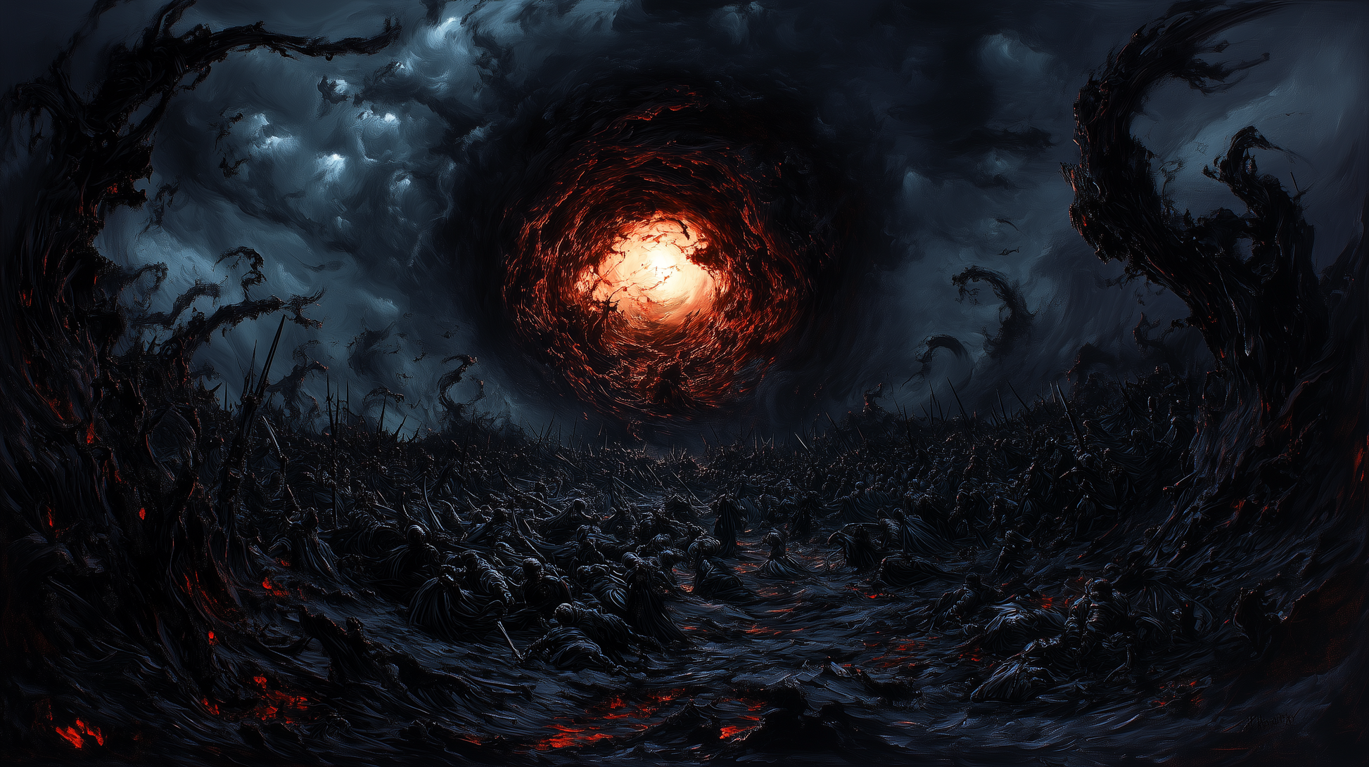 - Die wogenden Armeen: Endlose Reihen von Kriegern, die inmitten eines dunklen Meeres von Chaos und Schatten kämpfen, repräsentieren die kollektive Kraft und den Überlebensdrang der Menschheit.