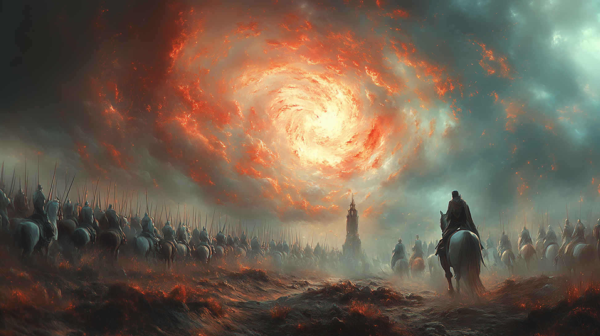 „Das Auge des Sturms“ ist ein packendes Kunstwerk, das die Spannung vor einem entscheidenden Moment einfängt. Mit einem wirbelnden Himmel, der wie ein lebendiges Wesen wirkt, und einer Armee, die auf eine ungewisse Zukunft blickt, spricht dieses Bild von Mut, Führung und dem unaufhaltsamen Vorwärtsdrang der Menschheit.