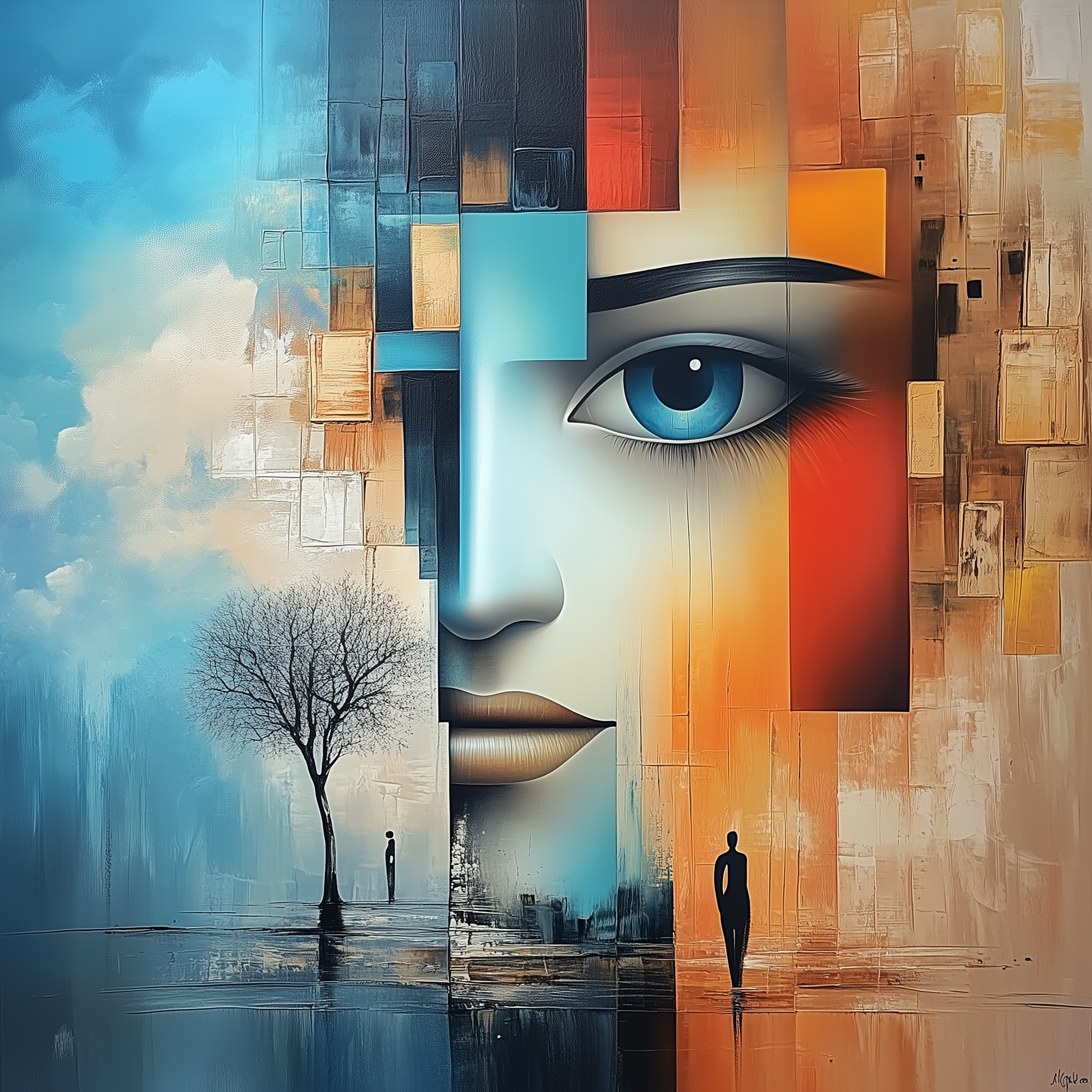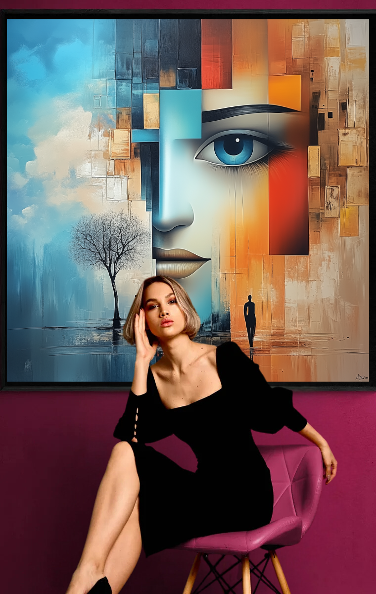 Dieses faszinierende Kunstwerk verbindet die Tiefe eines durchdringenden Blicks mit einer surrealen Landschaft aus Farben, Formen und Symbolen. „Das Fenster zur Seele“ ist eine Einladung, über die Perspektiven nachzudenken, die uns verbinden – mit uns selbst und der Welt um uns herum.