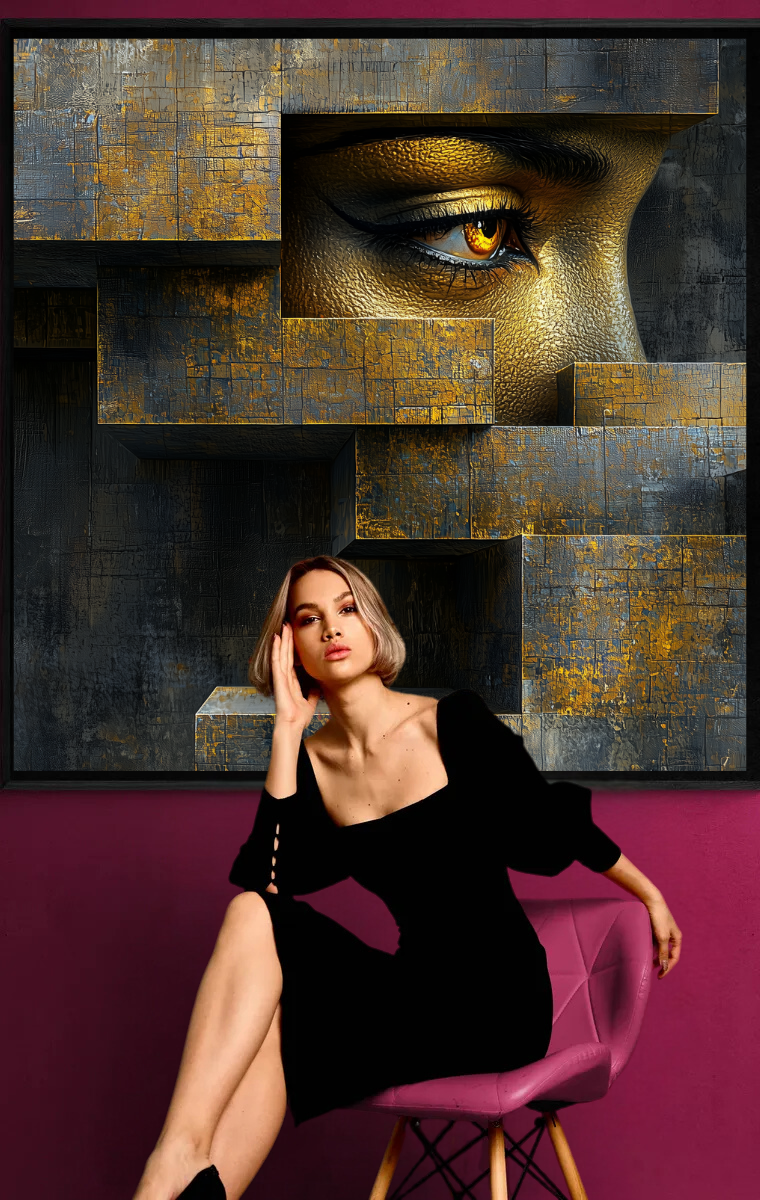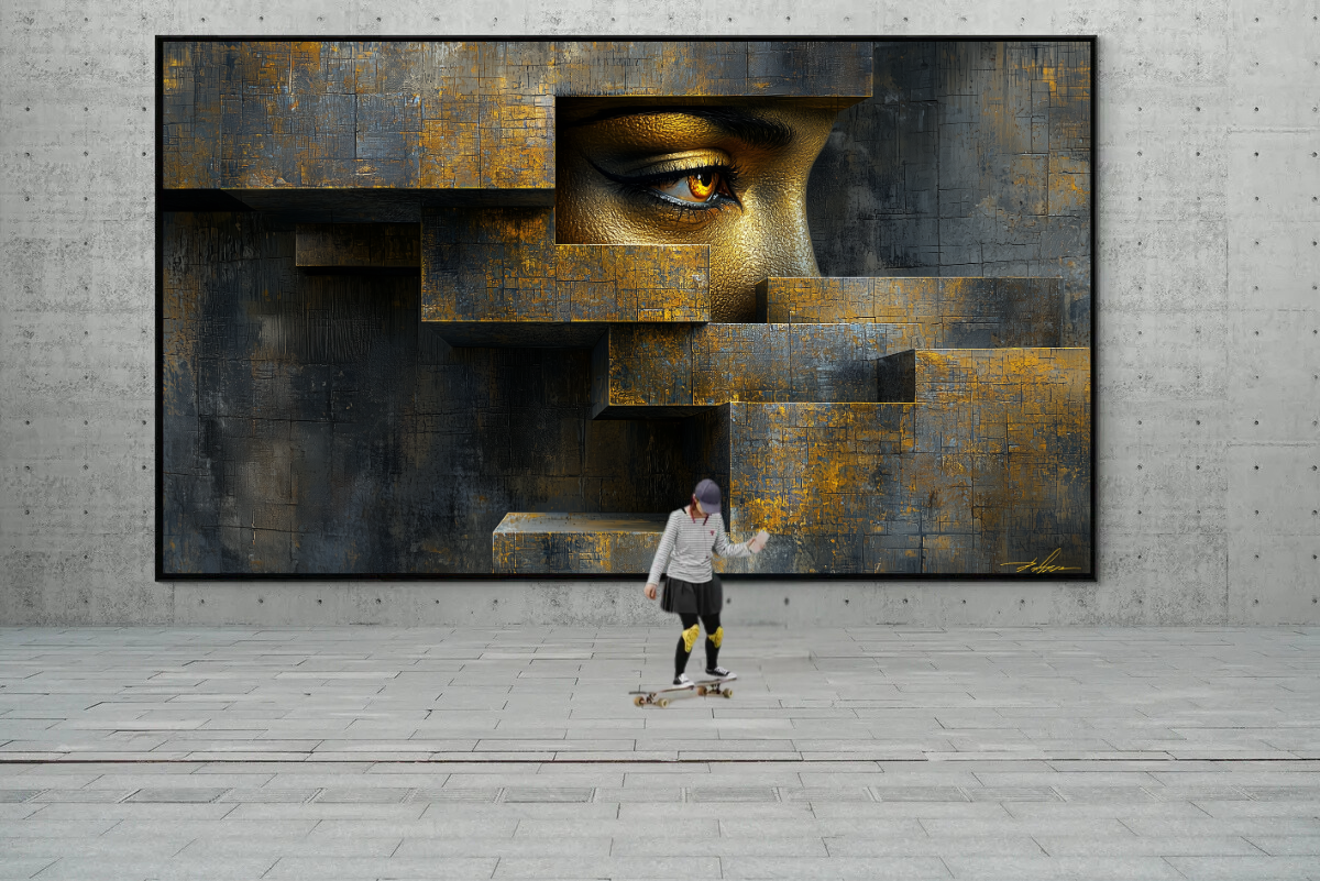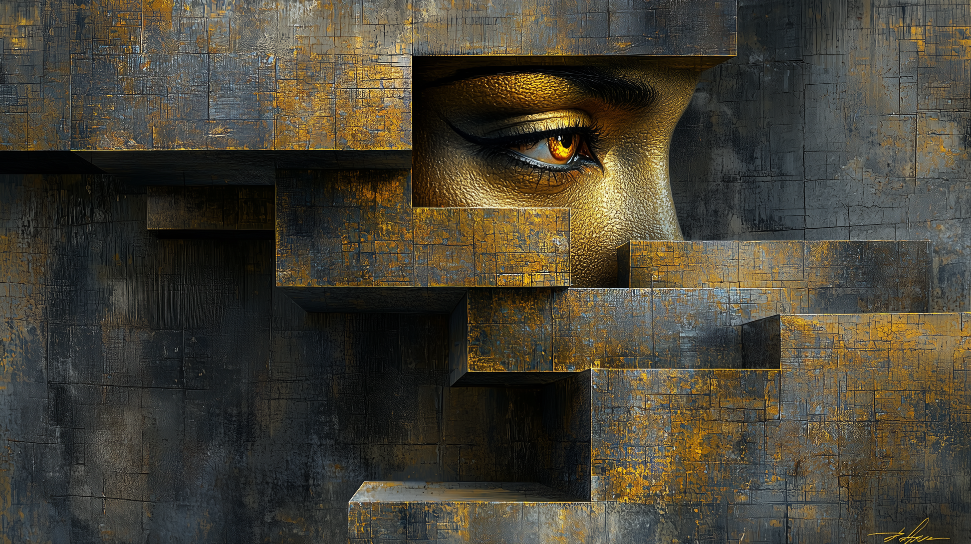 „Das goldene Auge“ repräsentiert den Blick, der über die Oberfläche hinausgeht – eine Einladung, die innere Wahrheit hinter den Strukturen zu erkennen. Es steht für den Kontrast zwischen der menschlichen Seele und der oft kalten, starren Welt um uns herum.