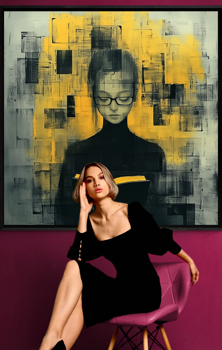 - Die Frau mit Brille: Sie symbolisiert die Suche nach Wissen und Weisheit, die durch das Lesen und das Lernen erreicht wird. Die geschlossenen Augen und der ruhige Ausdruck vermitteln Fokus und Hingabe.