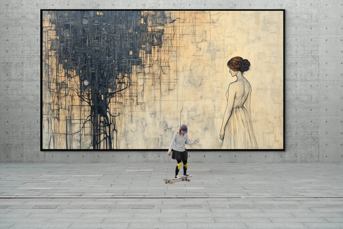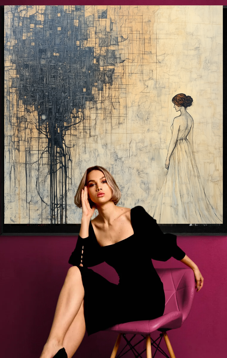 Dieses poetische Kunstwerk vereint filigrane Linien und eine sanfte Farbpalette, um die stille Begegnung einer Frau mit einem komplexen Geflecht von Erinnerungen darzustellen. „Das Netz der Erinnerungen“ ist eine visuelle Metapher für die Kunst und Weise, wie Gedanken, Erfahrungen und Emotionen sich verweben und unsere Geschichte erzählen.