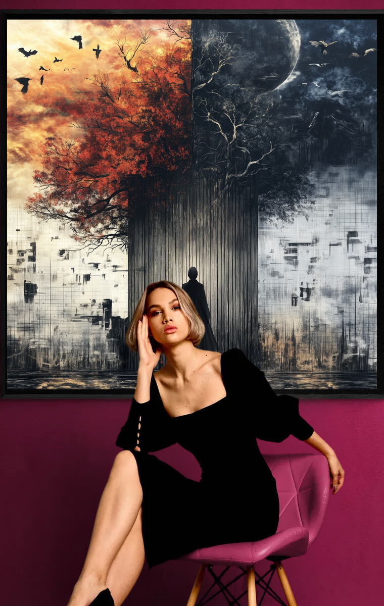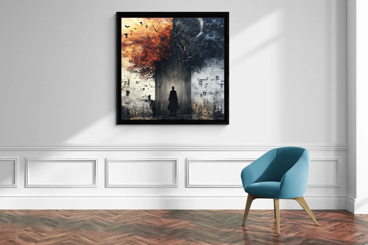 Dieses beeindruckende Kunstwerk fängt den Moment des Übergangs zwischen zwei gegensätzlichen Welten ein: eine glühende, lebendige Seite und eine kühle, düstere. „Das Tor der Dualität“ zeigt einen einsamen Wanderer vor einem mächtigen Baum, der das Bindeglied zwischen Tag und Nacht, Leben und Tod darstellt.