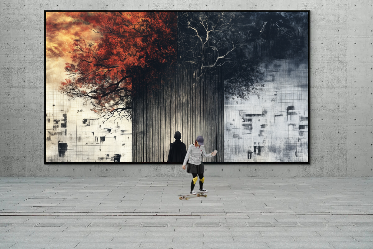 - Die kontrastierenden Welten: Die feurigen Farben der linken Seite und die kühlen, monochromen Töne der rechten Seite stellen Leben und Verfall, Hoffnung und Reflexion dar.