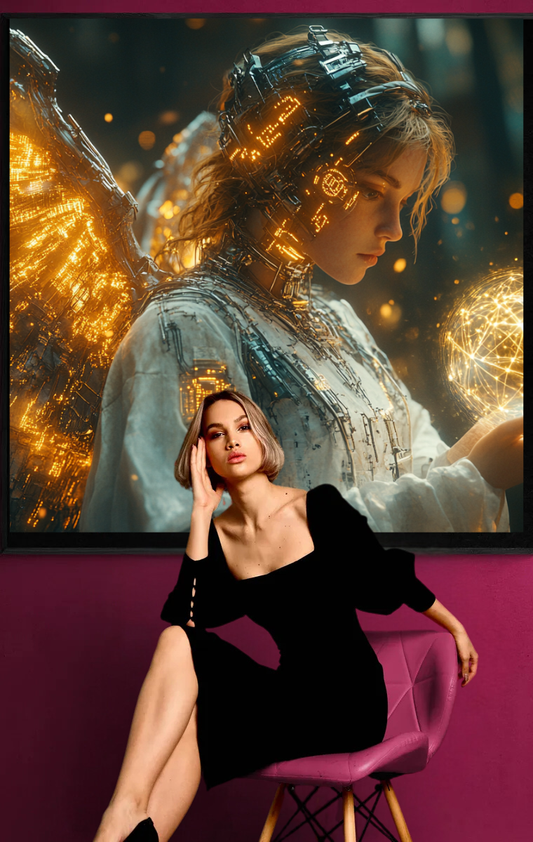 „Der Lichtwächter“ ist ein atemberaubendes Kunstwerk, das die Essenz eines futuristischen Engels einfängt, umhüllt von leuchtenden, goldenen Details. Der Engel, gekleidet in eine Mischung aus traditioneller Robe und metallischen Strukturen, hält eine leuchtende Kugel aus reiner Energie in seinen Händen, während seine mechanischen Flügel wie ein strahlendes Netz aus Licht hinter ihm erleuchten. Die lebhaften Details und die realistische Darstellung machen dieses Werk zu einem Meisterstück zwischen Fantasie und moderner Technologie.
