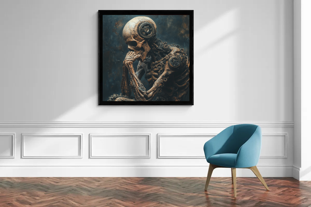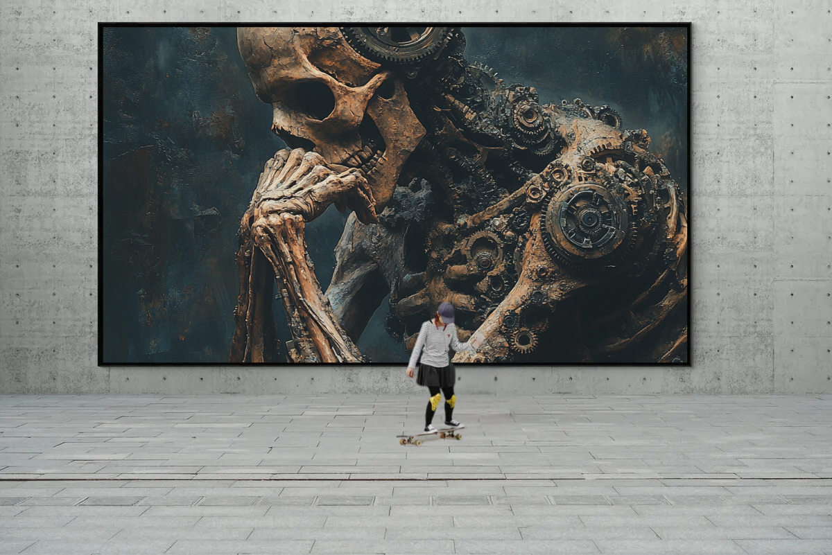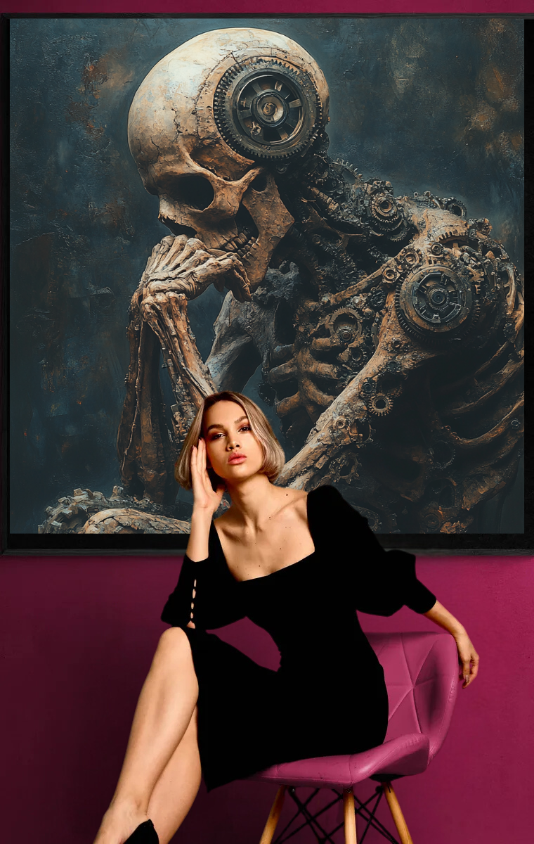 Mit „Der Mechanische Denker“ holen Sie sich ein kunstvolles und symbolträchtiges Werk in Ihre Räume – ideal für alle, die die Grenzen von Mensch und Maschine hinterfragen und die Vergänglichkeit in einer modernen, dystopischen Form erleben möchten.