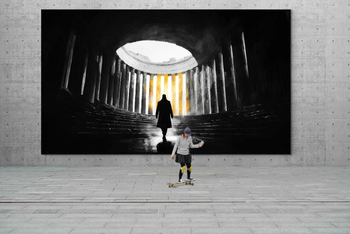 Tauchen Sie ein in eine zeitlose Szenerie, die die Grenzen von Vergangenheit, Gegenwart und Zukunft durchbricht. „Der Tempel des Lichts“ ist ein beeindruckendes Kunstwerk, das die Erhabenheit antiker Architektur mit einer modernen, symbolischen Lichtführung kombiniert.