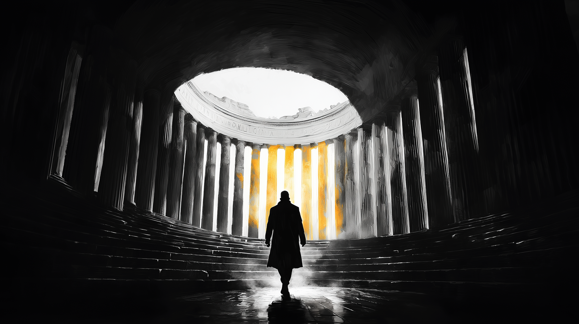 - Die einsame Silhouette: Ein Reisender, der zwischen den Schatten der Vergangenheit und dem Licht der Zukunft steht.