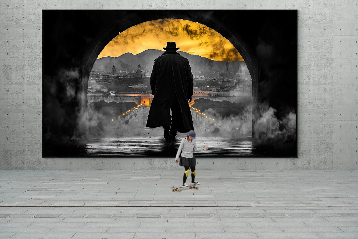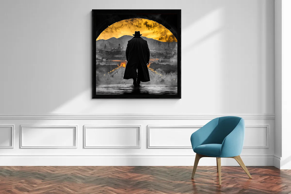 „Der Weg in die Dämmerung“ ist ein faszinierendes Kunstwerk, das die kraftvolle und mysteriöse Figur eines Mannes in einem langen Mantel und Hut darstellt, der in die Ferne schaut. Er betritt eine Stadt, die von einem intensiven orangefarbenen Sonnenuntergang beleuchtet wird. Das Bild vermittelt die Spannung und das Abenteuer, das mit dem Eintritt in das Unbekannte einhergeht, und spielt mit der Ästhetik des Film Noir.