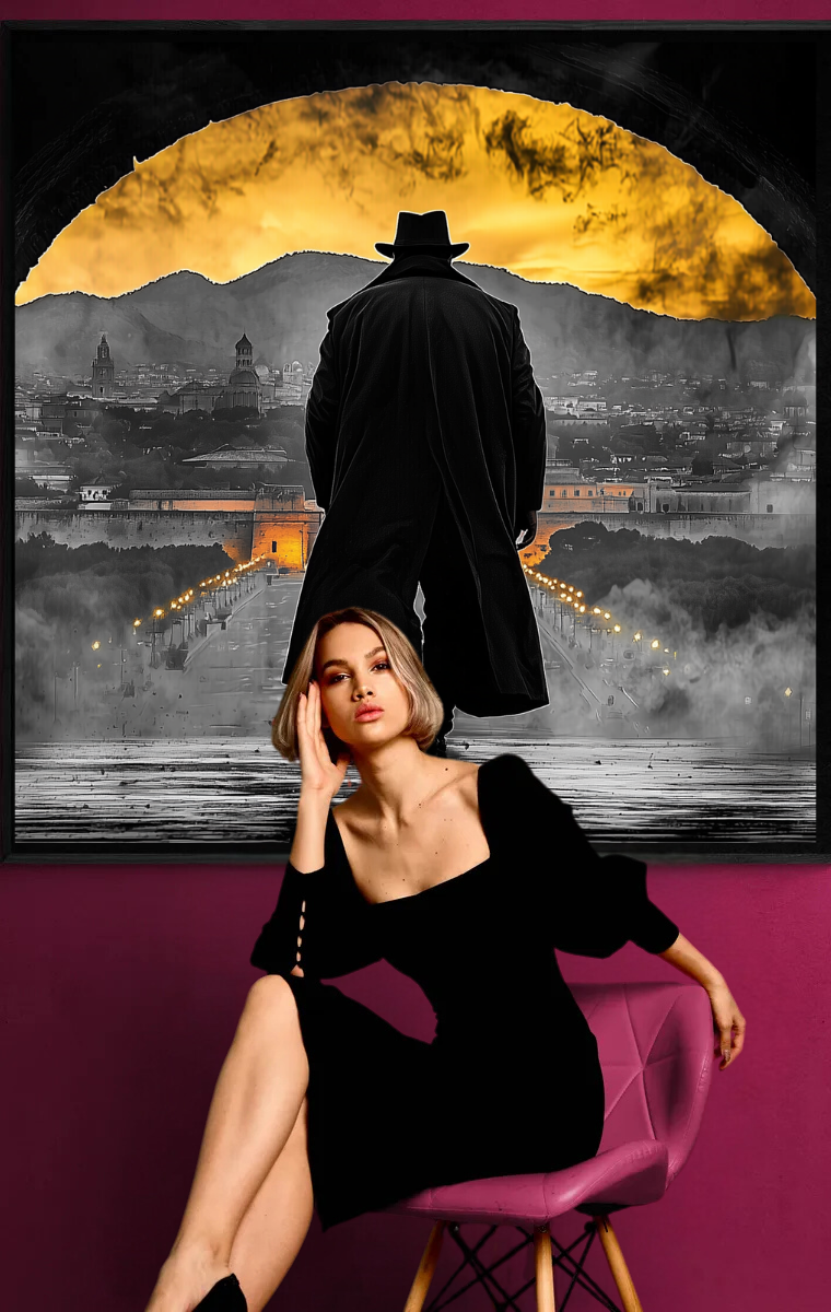 - Themenorientierte Galerien oder Bars: Der Film Noir-Stil dieses Werks macht es zu einem perfekten Akzent für Orte, die eine geheimnisvolle, klassische oder nostalgische Atmosphäre suchen.