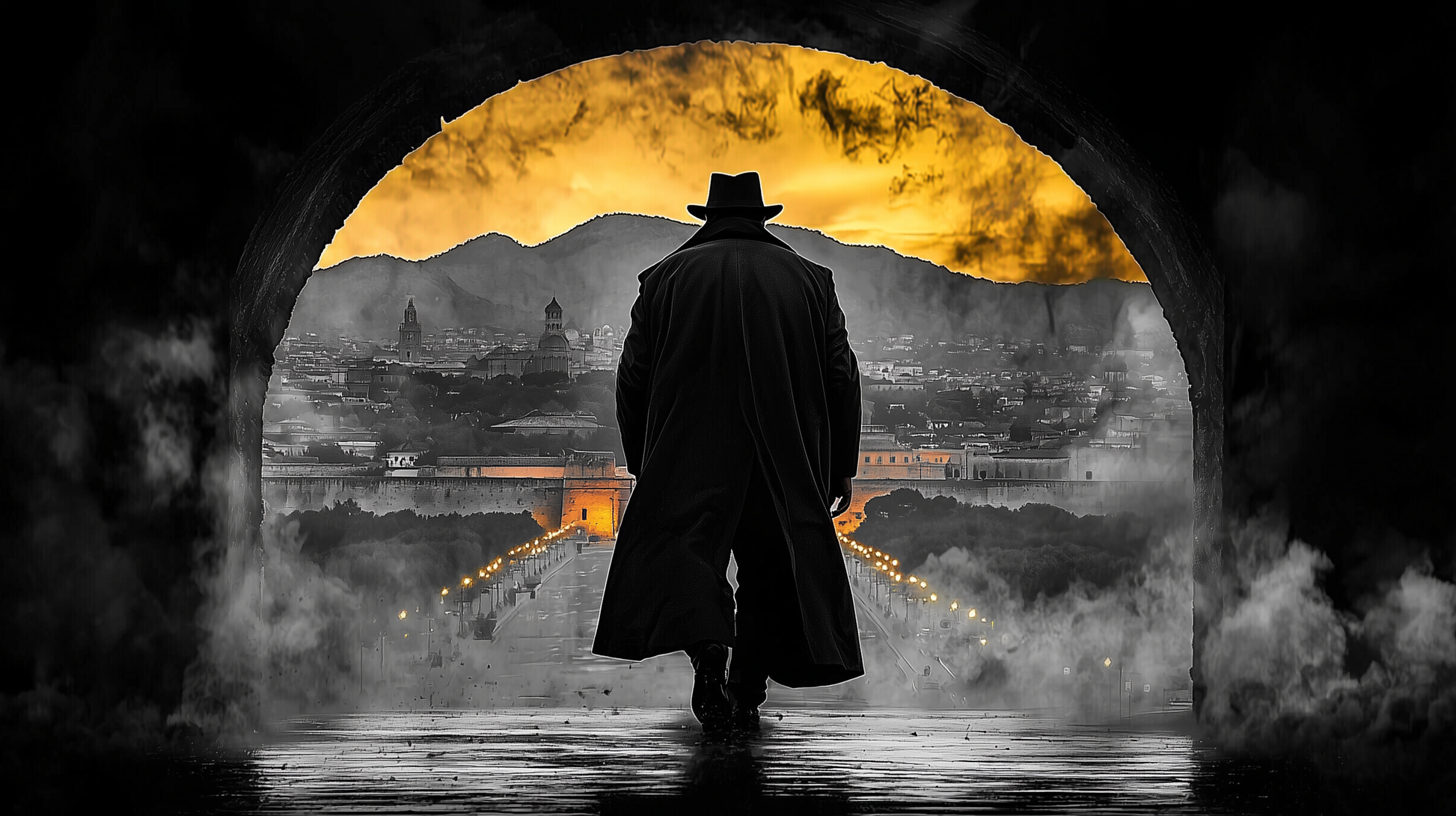 - Der Mann im Vordergrund: Der Mann in Mantel und Hut erinnert an einen Detektiv oder Wanderer, der entschlossen ist, in eine Stadt zu gehen, deren Geheimnisse er erforschen will. Seine Gestalt symbolisiert Mut, Entschlossenheit und eine geheimnisvolle Reise, die er antritt.