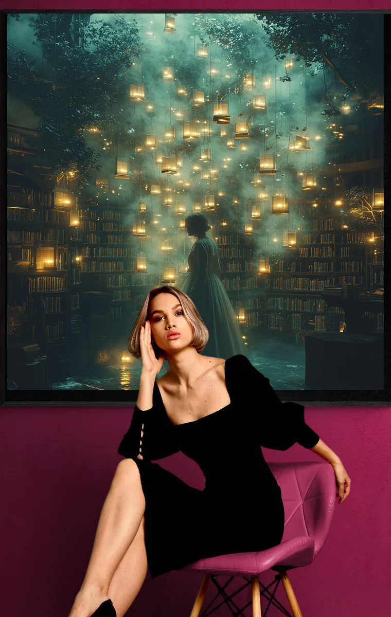 „Die Bibliothek der Lichter“ entführt den Betrachter in eine märchenhafte Welt, in der Bücher wie schwebende Laternen aus Licht zwischen den Bäumen hängen und die Umgebung mit einem sanften, warmen Schein erfüllen. Eine geheimnisvolle Gestalt in einem eleganten Kleid steht im Zentrum dieser magischen Szene, umgeben von einer Atmosphäre der Stille und der Erleuchtung. Der Nebel und das weiche Licht verleihen dem Bild eine träumerische, fast übernatürliche Qualität.