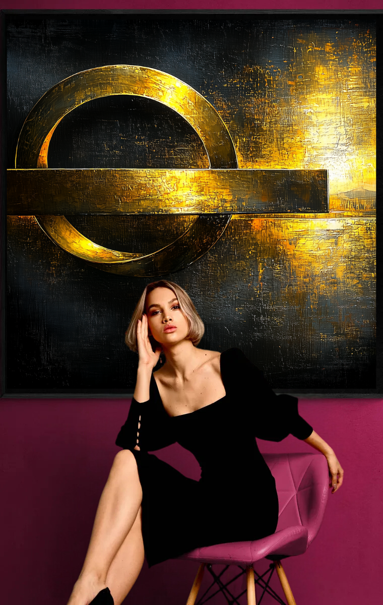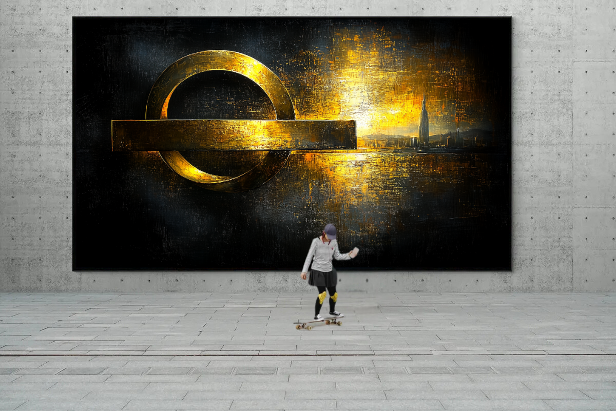 „Die goldene Skyline“ vereint die Majestät der Architektur mit der Strahlkraft des Lichts. Der leuchtende Kreis, verbunden mit der Silhouette einer Stadt, symbolisiert Fortschritt, Unabhängigkeit und die Verbindung zwischen urbaner Moderne und universellem Gleichgewicht.