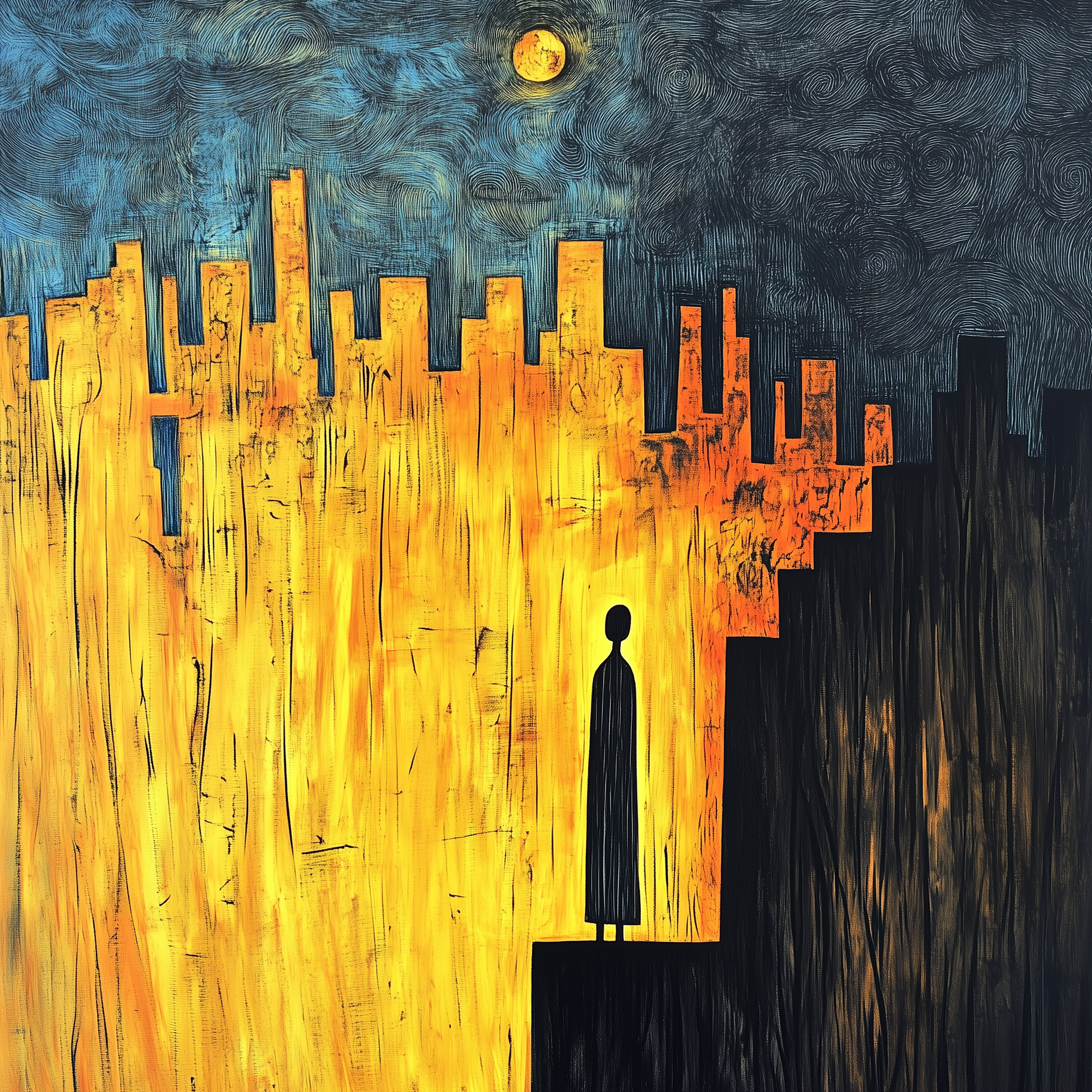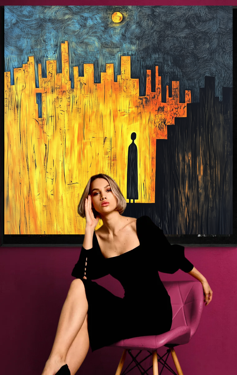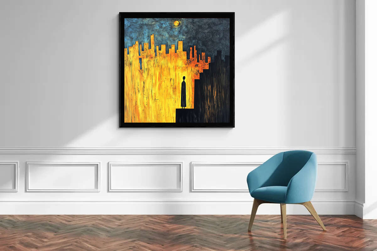Dieses fesselnde Kunstwerk zeigt die Silhouette einer Figur, die an der Grenze zwischen einer leuchtenden Stadt und einer dunklen Leere steht. „Die Grenze des Lichts“ ist eine Metapher für Entscheidungen, Übergänge und die Momente, in denen wir zwischen Sicherheit und Ungewissheit stehen.