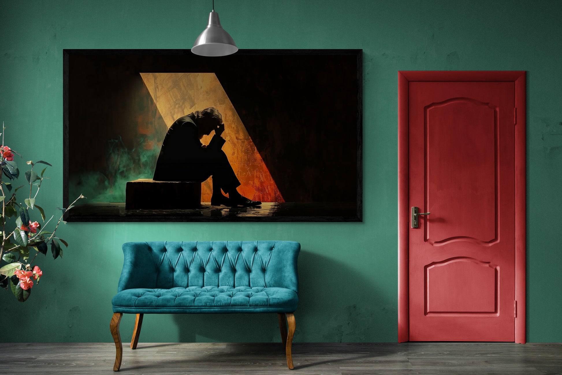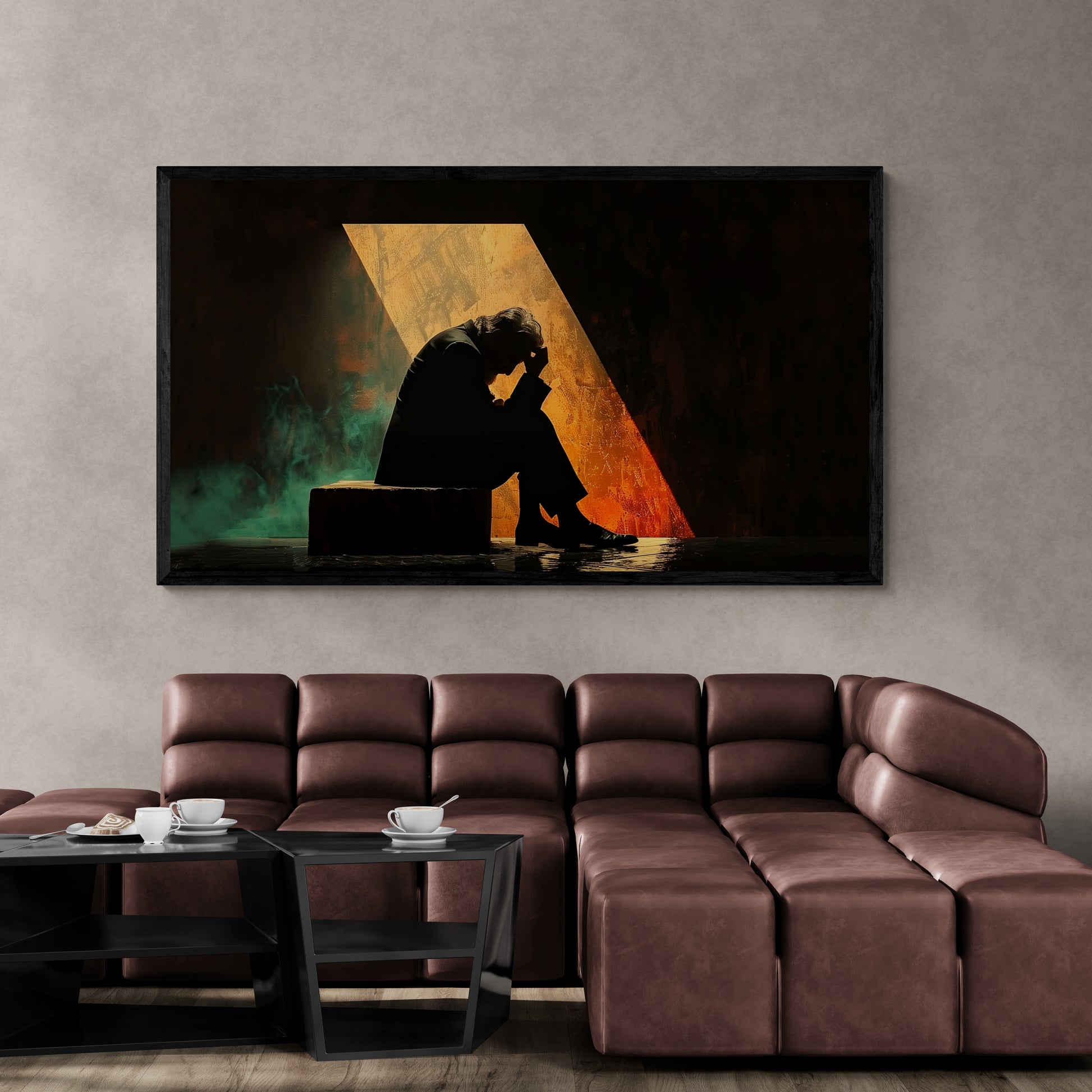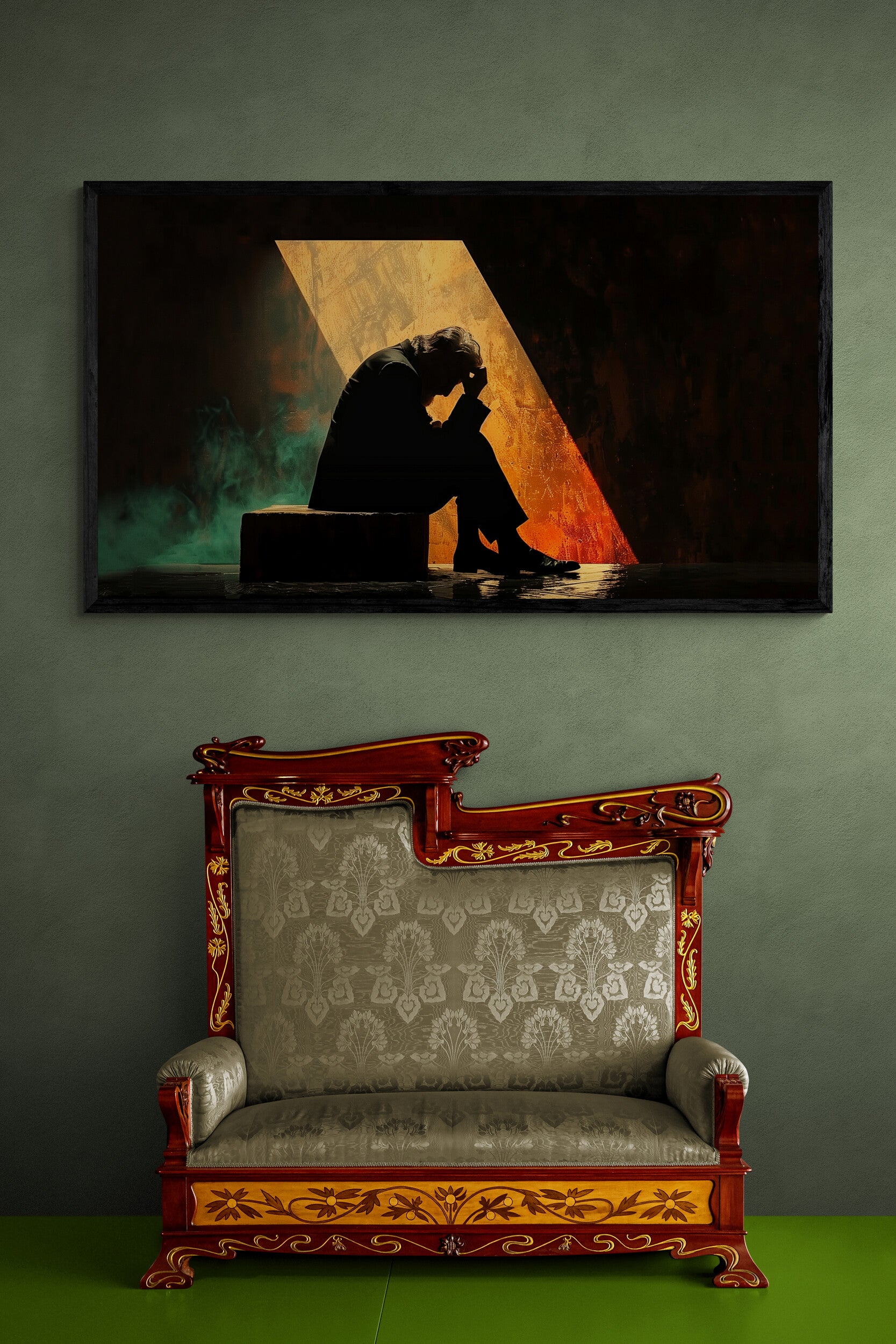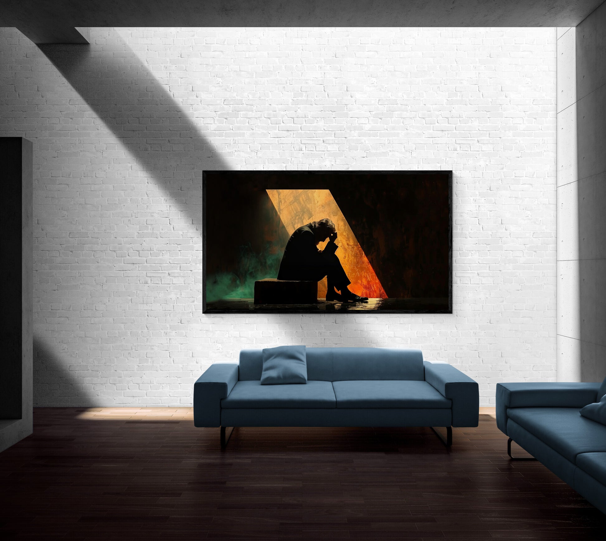 „Die Last der Gedanken“ ist ein Kunstdruck -Motiv, das den Moment stiller Innenschau in einem atmosphärisch dichten Zusammenspiel aus Dunkelheit und Licht taucht. Die silhouettierte Gestalt eines Mannes im Vordergrund symbolisiert tiefe Nachdenklichkeit , während die scharf umrissene, orangefarbene Form in ihrem Rücken einen Gegenpol aus Wärme und Energie bildet. Das Werk lädt Betrachterinnen und Betrachter dazu ein, innezuhalten und ihre eigenen Gedanken nachzuspüren – im Spannungsfeld von Verzweiflung und Zuversicht.