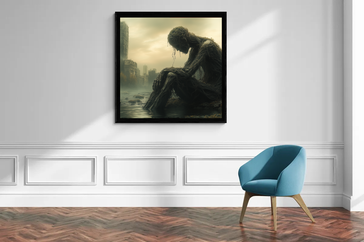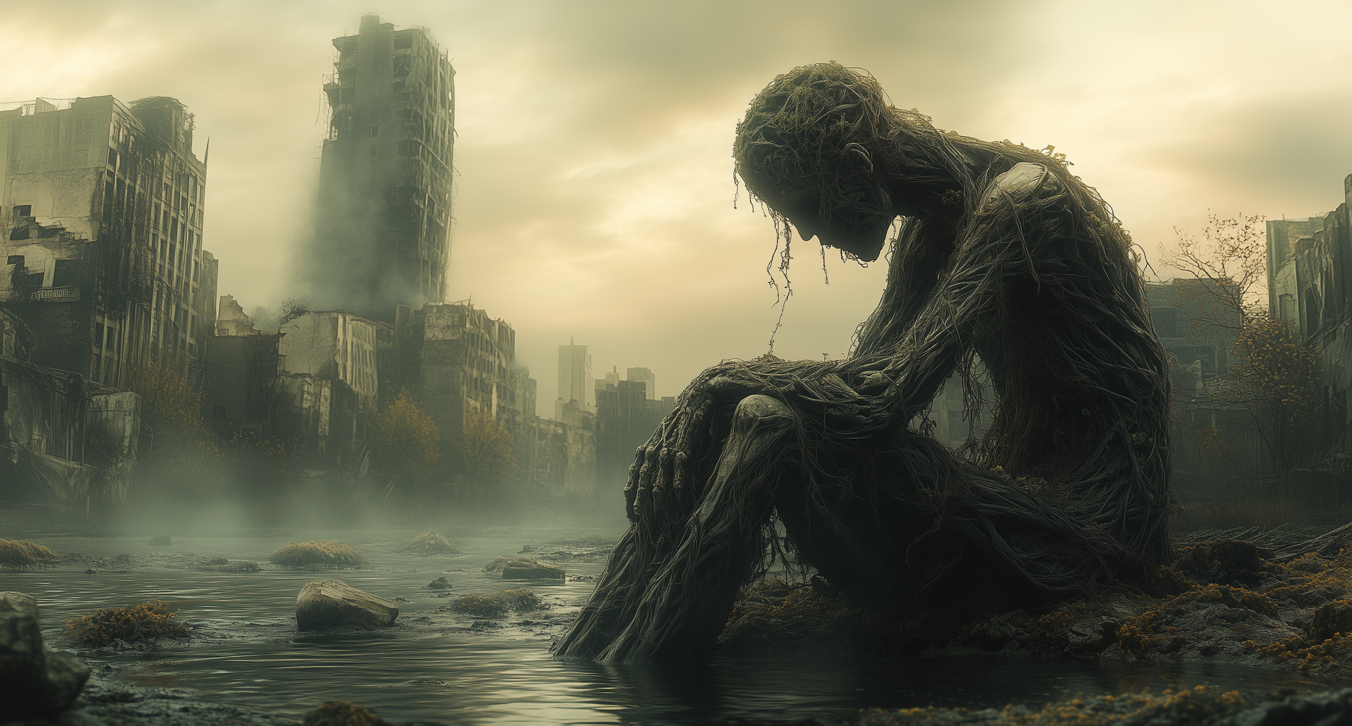 „Die Ruinen der Menschlichkeit“ ist ein tiefgründiges Kunstwerk, das die Verbindung zwischen der Natur und dem Menschen in einer dystopischen Zukunft beleuchtet. Das zentrale Motiv – ein humanoider Körper aus ineinander verschlungenen Reben und Knochen – symbolisiert die Verschmelzung von Natur und den Untergang der Zivilisation.