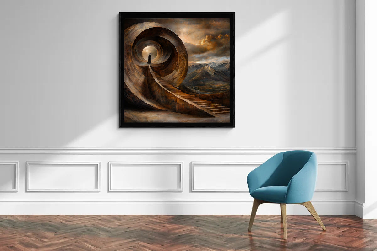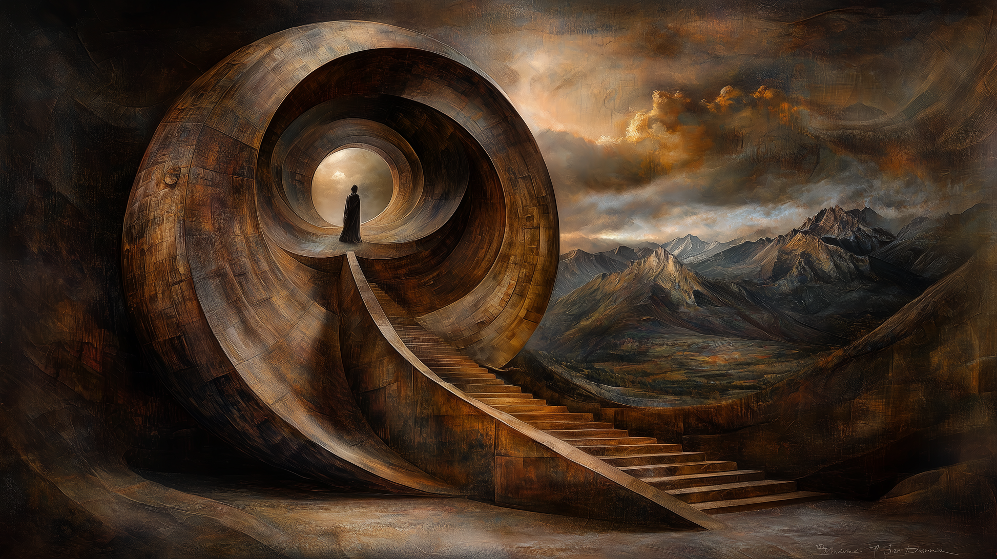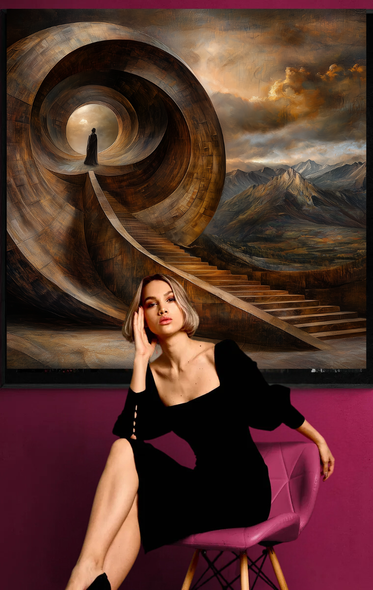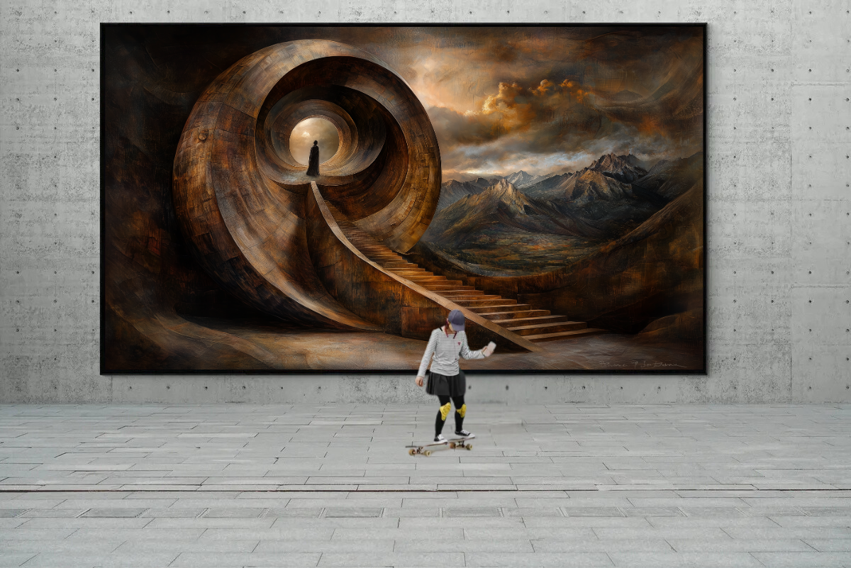 Dieses eindrucksvolle Kunstwerk vereint die majestätische Weite der Natur mit der mystischen Tiefe abstrakter Formen. „Die Schwelle zur Ewigkeit“ symbolisiert eine Reise – physisch und spirituell – auf der Suche nach Antworten jenseits des Sichtbaren. Eine Gestalt, die vor einem Portal schwebt, erinnert uns daran, dass wahres Wachstum nur im Mut liegt, unbekannte Wege zu beschreiten.