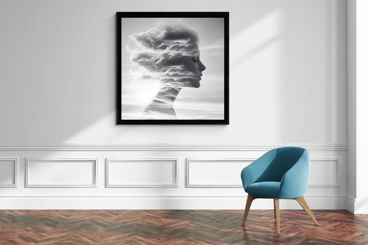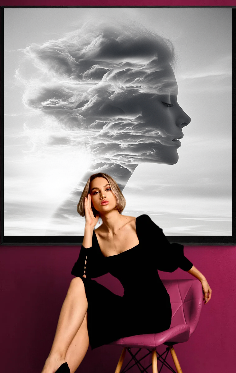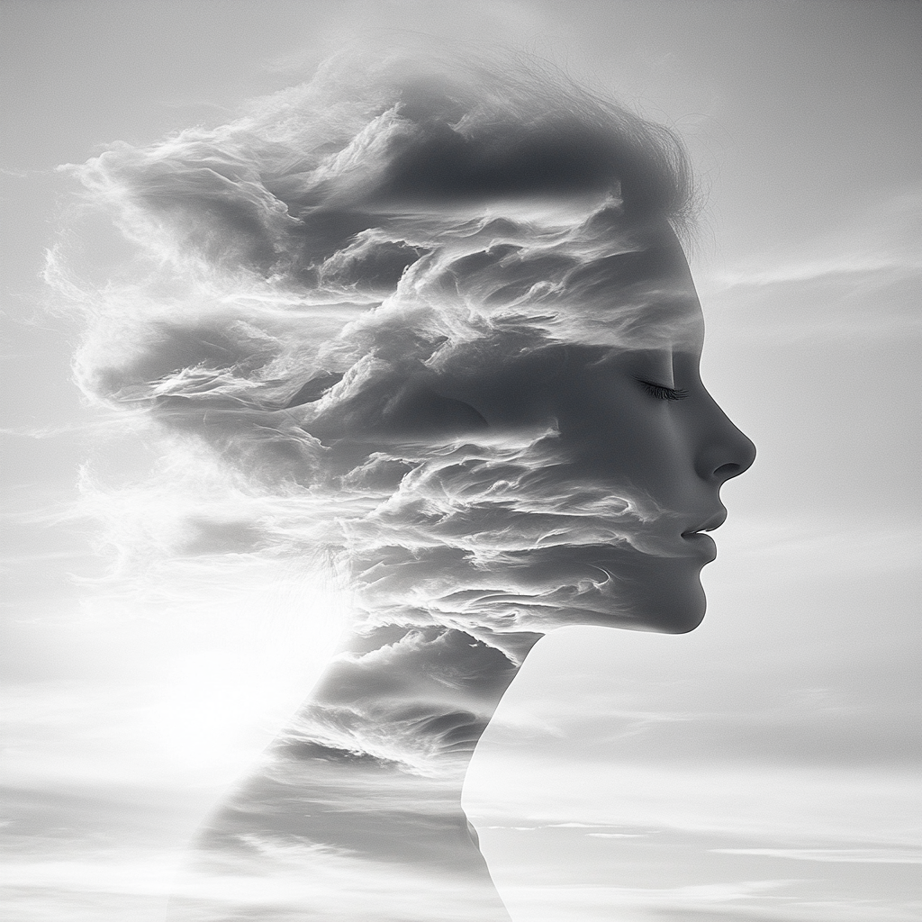„Die Wolkentänzerin“ verkörpert die Leichtigkeit und Schönheit der Träume in einer friedlichen, surrealen Darstellung. Das elegante Profil einer Frau, die sanft in Wolken eingebettet ist, schafft eine Atmosphäre der Ruhe und Erhabenheit. Die sanften Grautöne und die filigranen Wolkenformen lassen den Betrachter in eine Welt der Fantasie eintauchen, wo Gedanken und Gefühle wie Wolken am Himmel schweben.