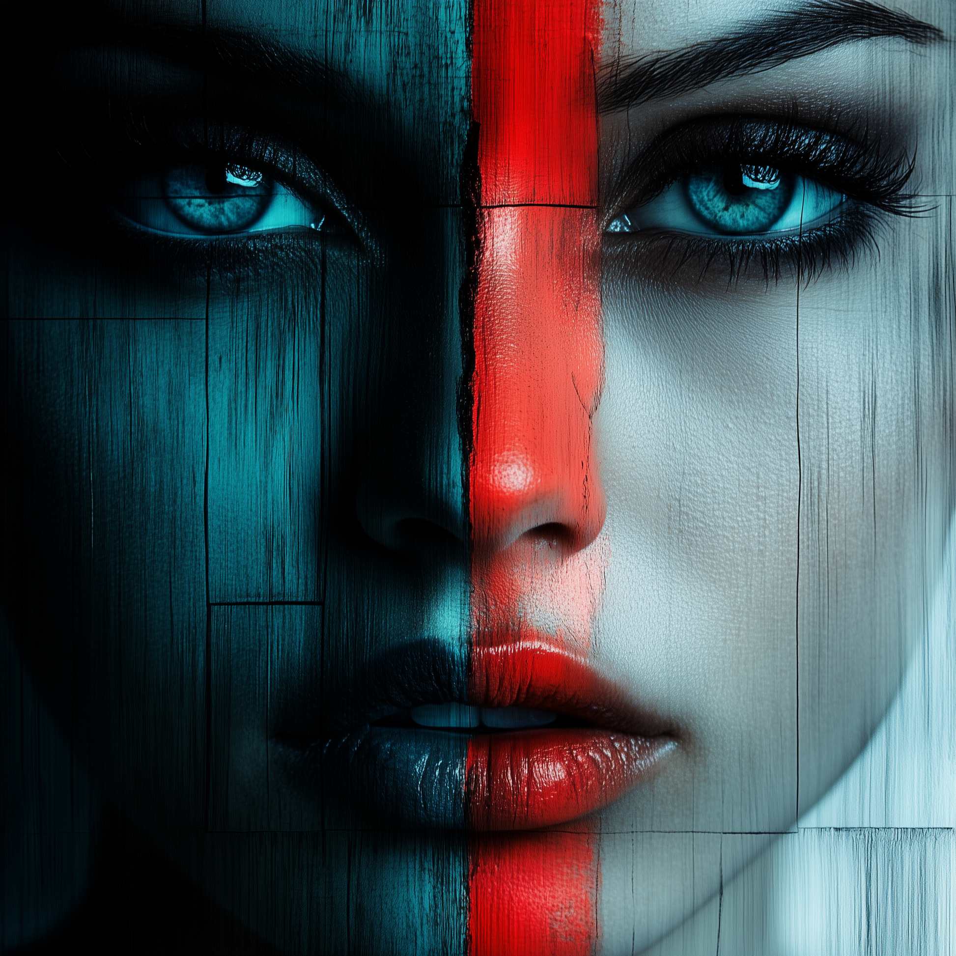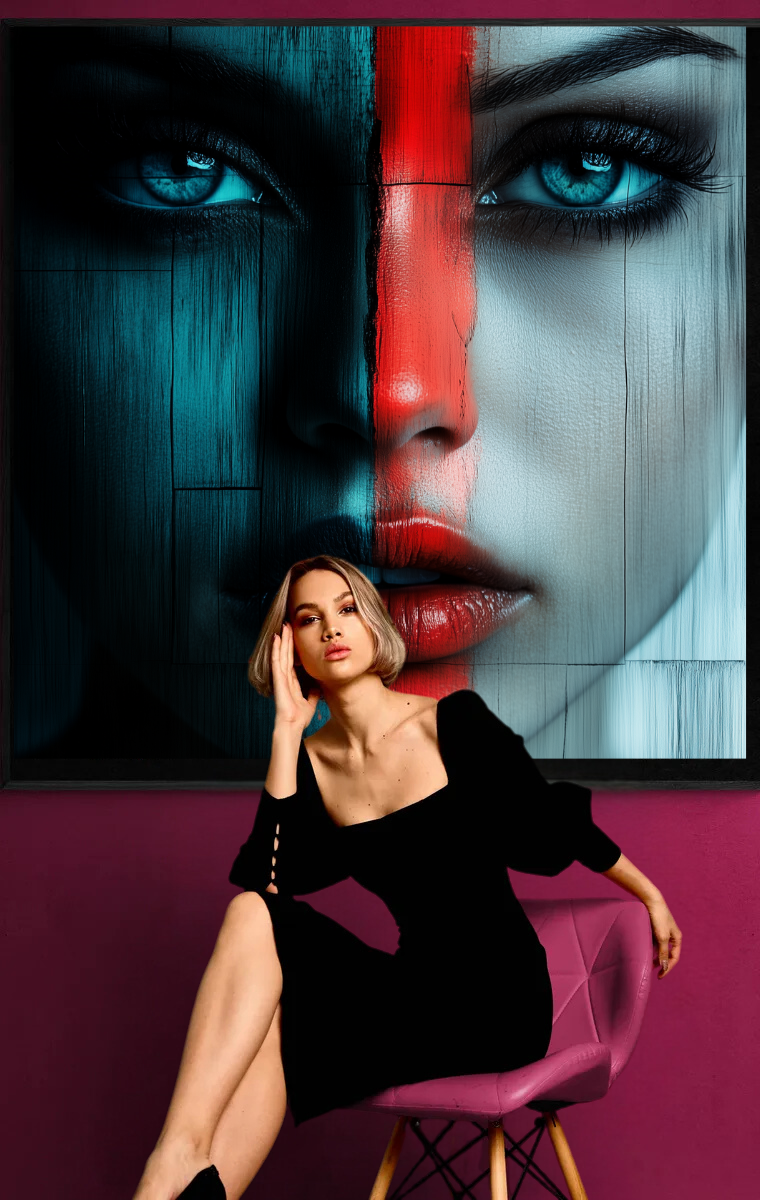 Tauchen Sie ein in die faszinierende Welt der Dualität mit diesem atemberaubenden Kunstdruck, der das Konzept von Licht und Schatten auf einzigartige Weise interpretiert. Die lebhaften Farben von tiefem Blau und kräftigem Rot teilen das Gesicht in zwei Hälften, was eine starke Symbolik der Gegensätze darstellt – das Mystische und das Leidenschaftliche, das Kühne und das Sanfte.