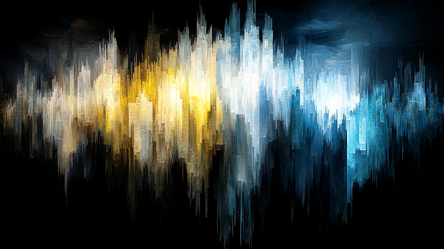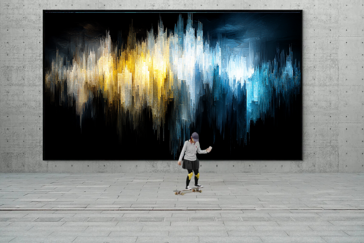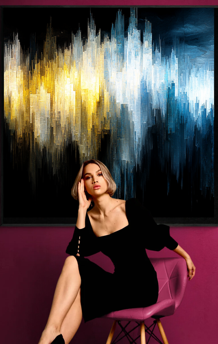 „Echo der Stadt“ fängt die kraftvolle Energie einer modernen Skyline in einer fesselnden Kombination aus goldenen, weißen und blauen Tönen ein. Die abstrakte Komposition erinnert an die pulsierende Dynamik einer Metropole, deren Konturen in einem rhythmischen Spiel von Licht und Schatten verschwimmen. Die aufeinander treffenden Farben erzeugen eine vibrierende Tiefe, die den Eindruck von urbanem Rauschen und Bewegung vermittelt.