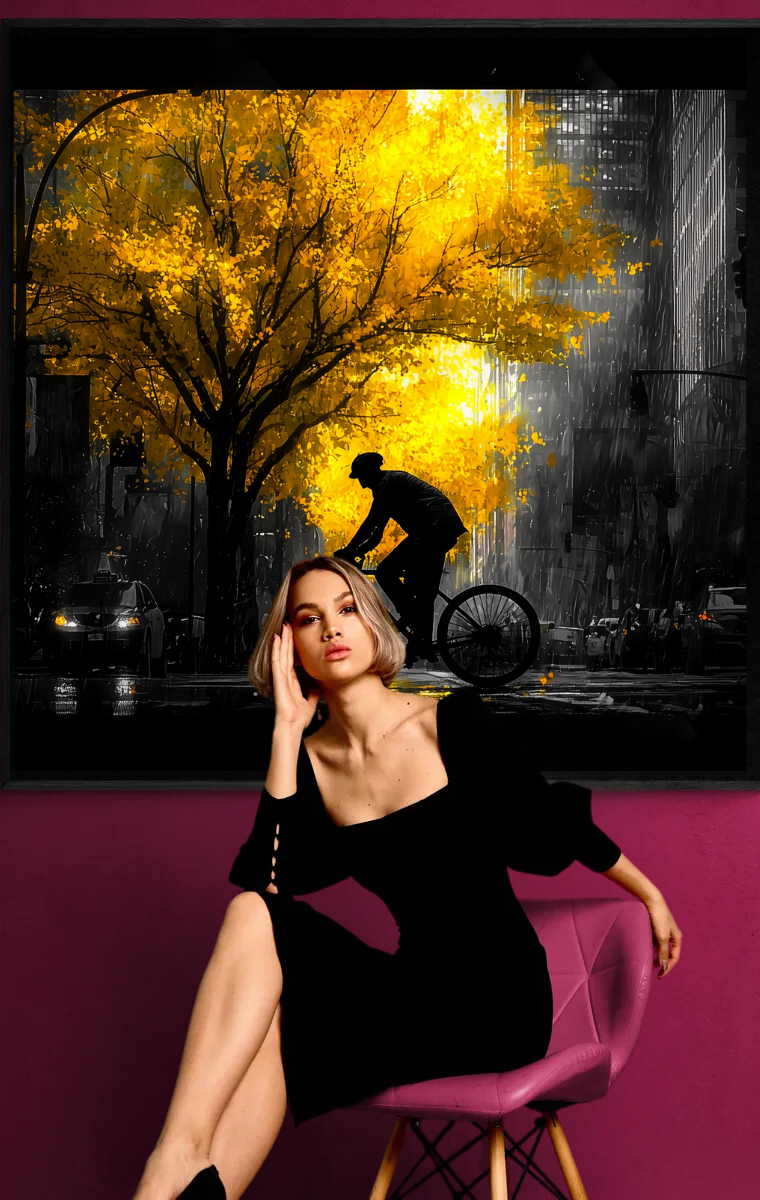 Interpretation und Bedeutung: „Ein Licht in der Stadt“ ist eine Hommage an die Momente der Schönheit und Hoffnung, die inmitten der modernen Welt auftauchen. Der Radfahrer könnte für jeden von uns stehen – Menschen, die sich durch das tägliche Leben bewegen, oft umgeben von Grau und Routine. Der Baum steht für die unerwarteten Momente der Freude, die wir erleben, sei es durch die Natur, eine unerwartete Begegnung oder einfach durch die Schönheit, die sich uns offenbart. Dieses Kunstwerk erinnert uns daran, dass es immer Lichtpunkte gibt, selbst in den dunkelsten Zeiten, und dass die Natur auch in der rauesten Umgebung ihren Platz findet.