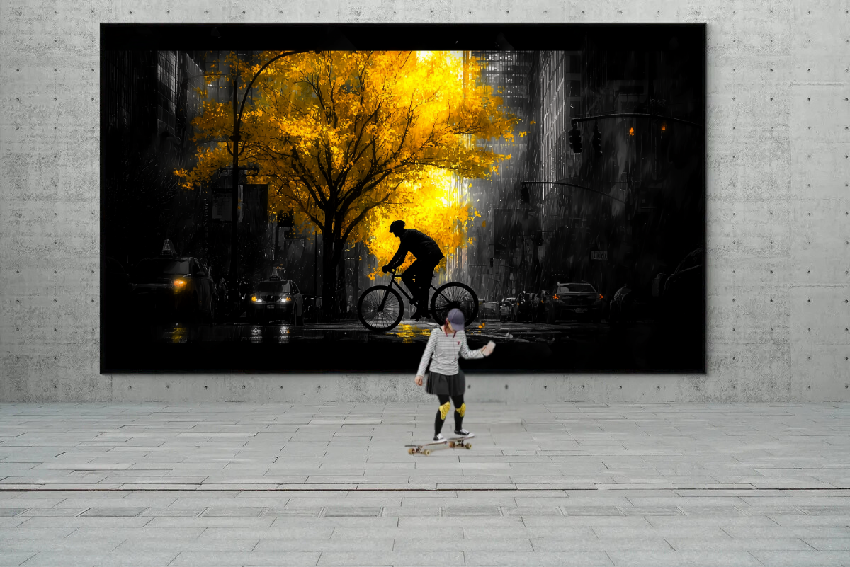 „Ein Licht in der Stadt“ ist ein eindrucksvolles Kunstwerk, das die Silhouette eines Radfahrers zeigt, der vor einem beeindruckenden, leuchtend gelben Baum durch eine städtische Szene fährt. Die Umgebung ist in Schwarz-Weiß gehalten, während der Baum in kräftigem Gelb leuchtet und den Mittelpunkt des Bildes bildet. Diese Komposition bringt das Licht, die Hoffnung und die Schönheit der Natur inmitten einer sonst düsteren städtischen Umgebung zum Vorschein.