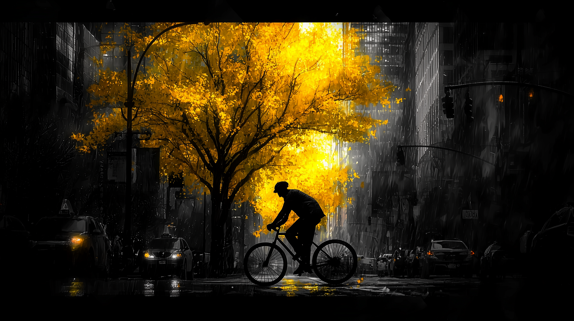- Der leuchtende Baum: Der Baum ist das zentrale Element des Bildes und wirkt wie ein strahlendes Licht in der Dunkelheit. Er symbolisiert Hoffnung, Leben und die Schönheit der Natur, die auch in der Härte des städtischen Lebens ihren Platz findet. Die gelben Blätter kontrastieren stark mit der grauen Umgebung und ziehen die Aufmerksamkeit des Betrachters magisch an.
