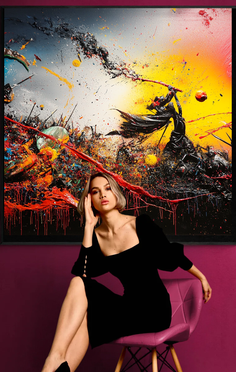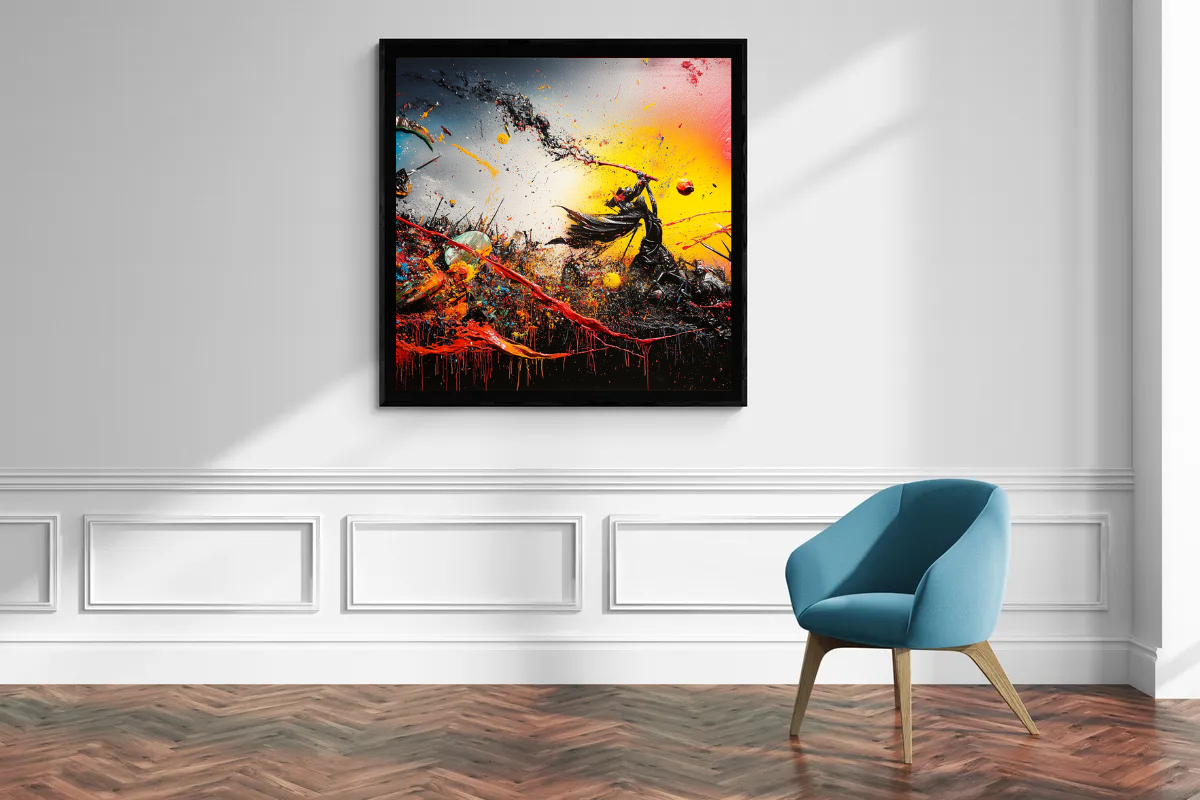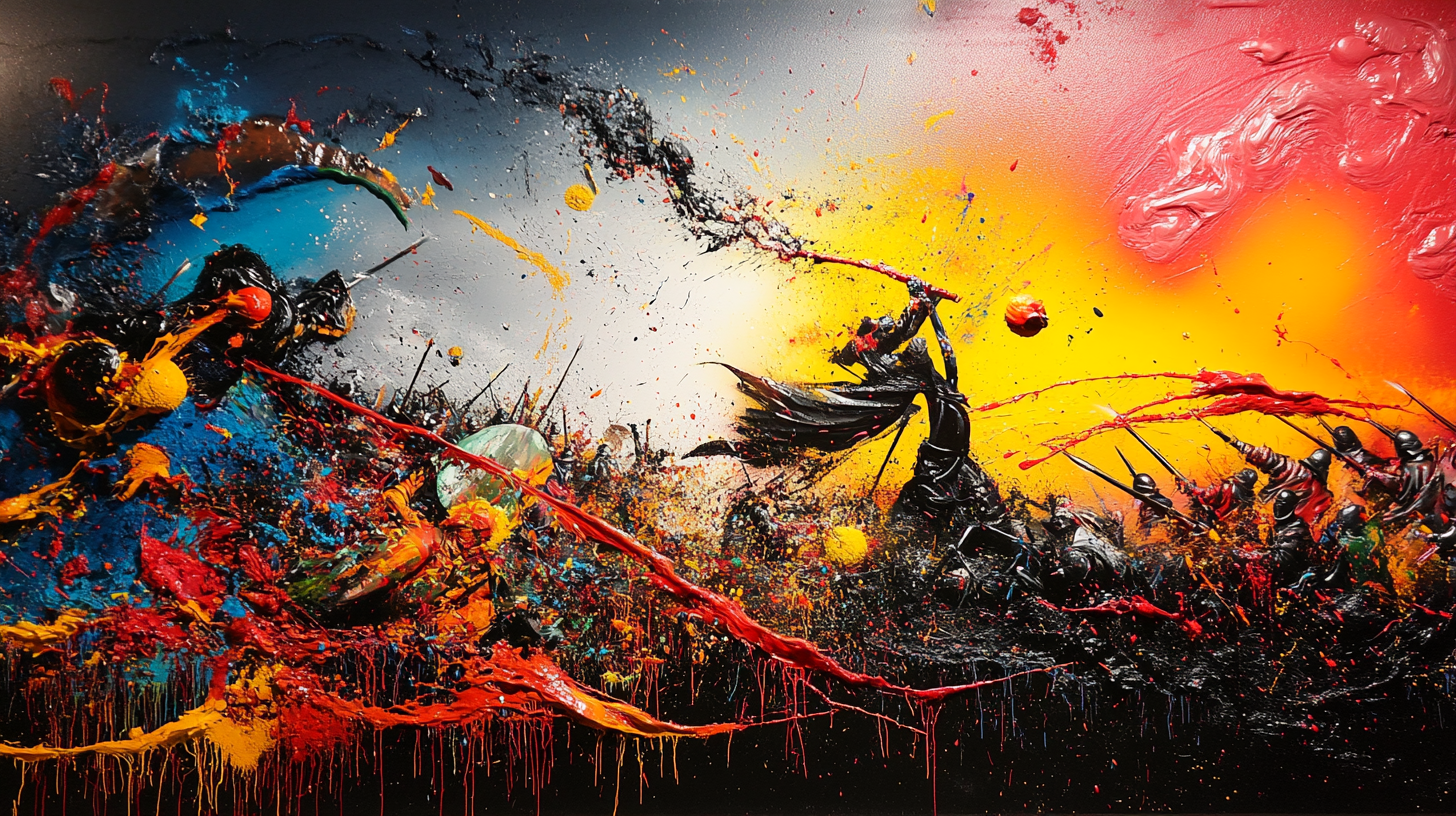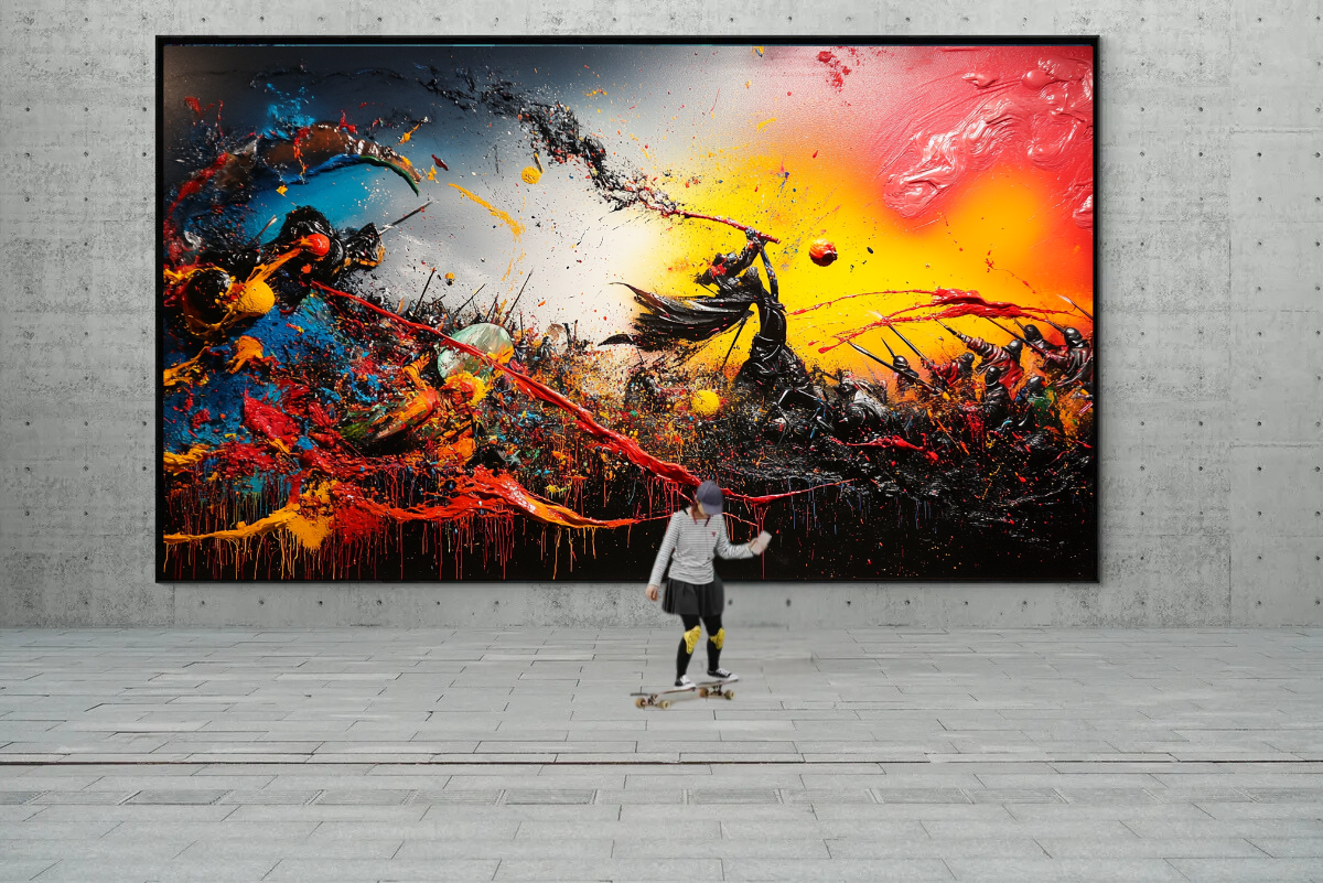 „Explosion der Schlacht“ ist ein spektakuläres Kunstwerk, das die Intensität und das Chaos einer epischen Schlacht in einer lebendigen und expressiven Komposition einfängt. Mit spritzenden Farben in kräftigem Rot, Gelb, Blau und Schwarz vermittelt dieses Werk die rohe Energie und das unbändige Momentum des Kampfes. Die dynamischen Pinselstriche und die dramatischen Farbverläufe schaffen das Gefühl einer explosiven Bewegung, während die Kriegerfiguren und Waffenelemente das Geschehen verstärken.