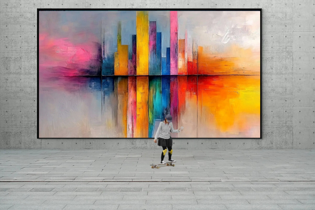 Mit „Farben der Skyline“ holen Sie sich die Essenz urbaner Lebendigkeit in Ihre Räume – ideal für Kunstliebhaber, die kräftige Farben und moderne, abstrakte Darstellungen schätzen.