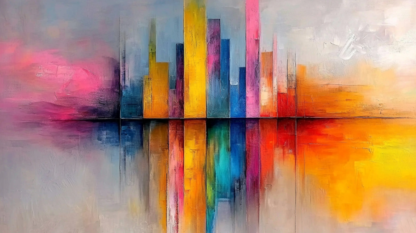 „Farben der Skyline“ ist eine abstrakte Darstellung einer modernen Stadt, die in einem leuchtenden Farbspiel aus Gelb-, Blau-, Pink- und Orangetönen eingefangen ist. Die lebhaften Farben fließen harmonisch ineinander und erzeugen eine dynamische Energie, die das pulsierende Leben der Großstadt widerspiegelt. Die klaren vertikalen Linien der Gebäude und ihre Reflexion im Wasser verleihen dem Bild eine faszinierende Tiefe.