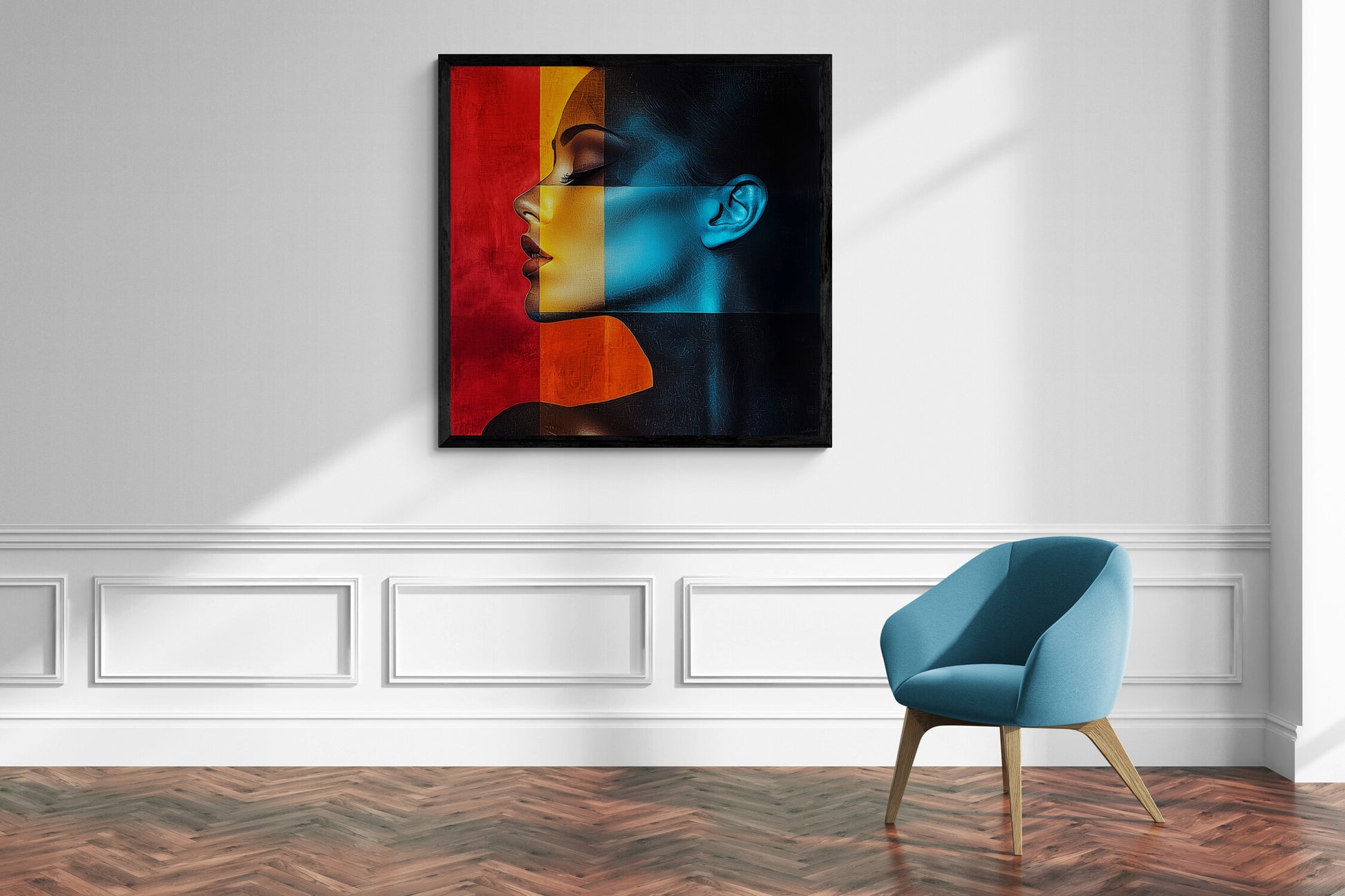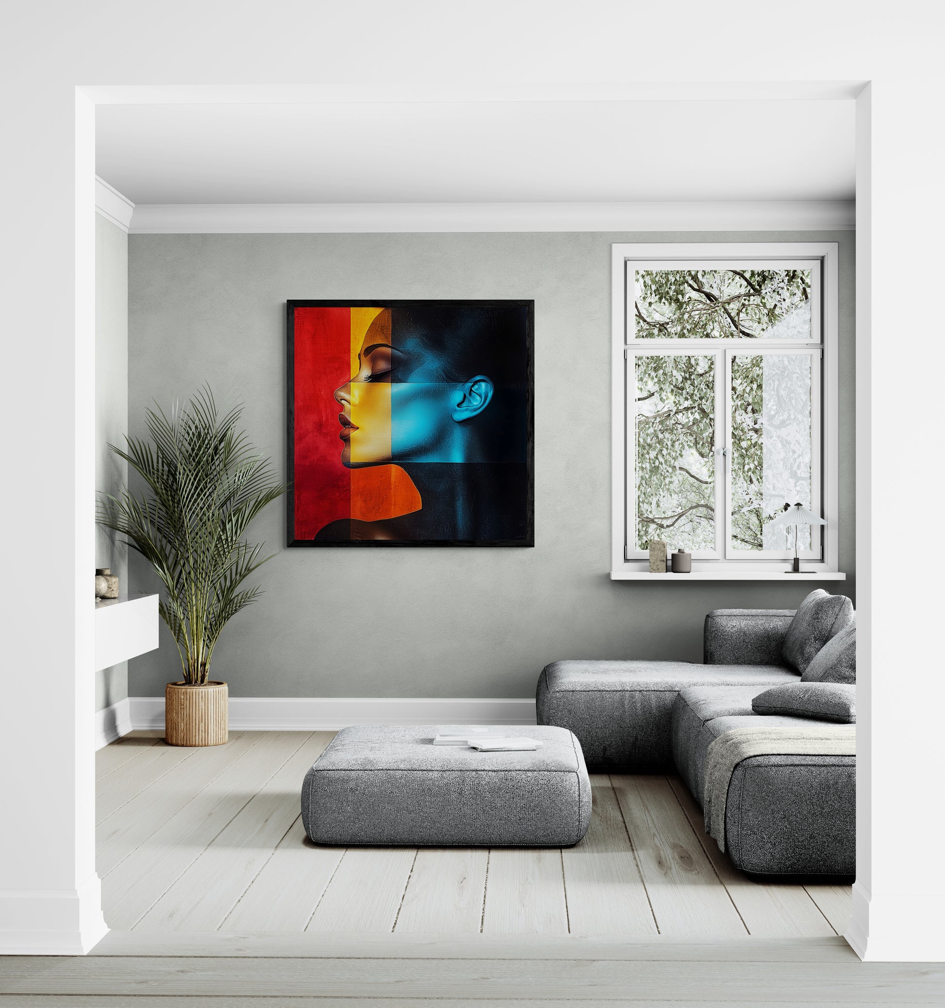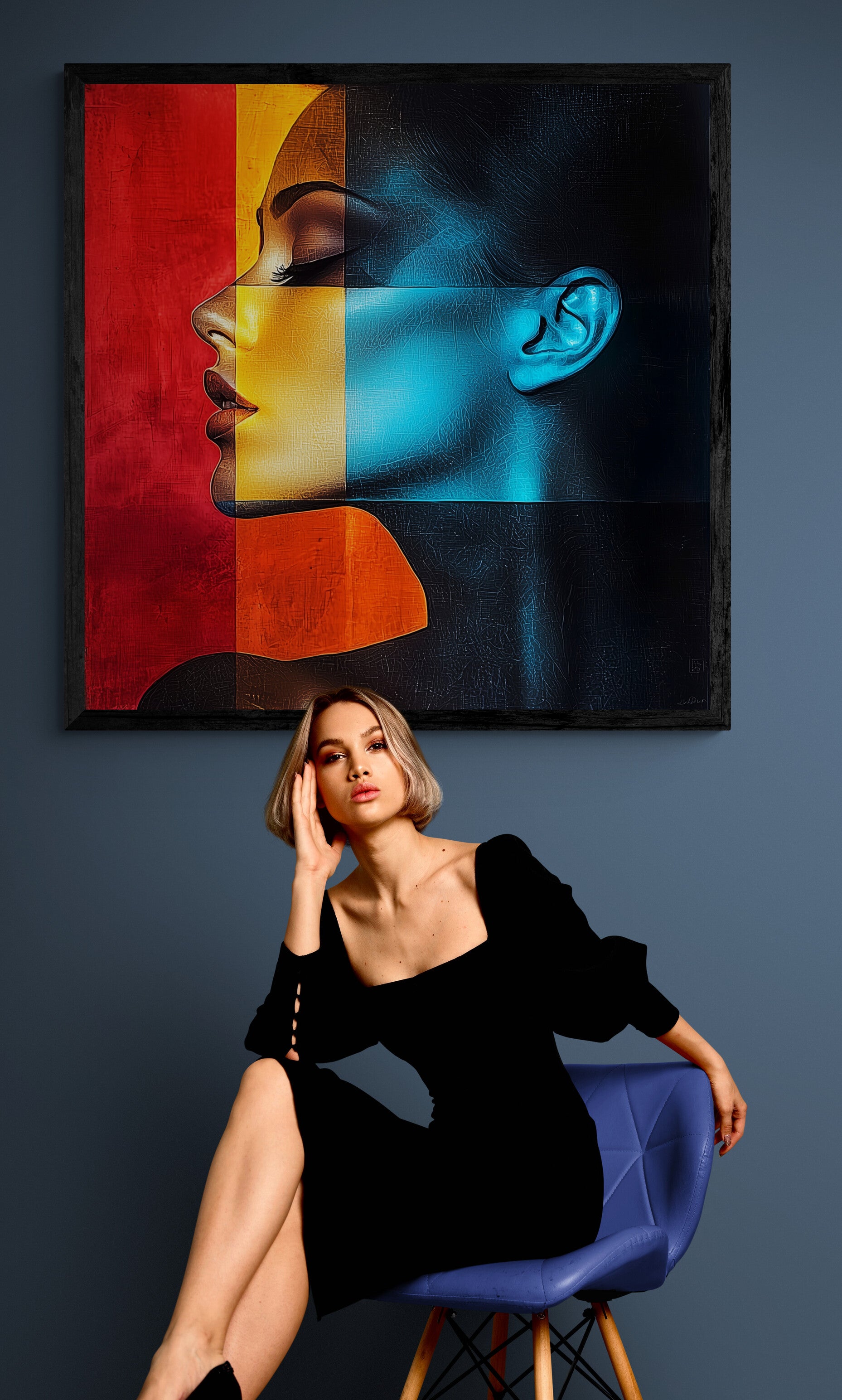 „Farbfenster der Seele“ ist ein faszinierendes Kunstdruck- Motiv, das die Schnittstelle zwischen menschlicher Anmut und den klaren Strukturen geometrischer Farbflächen inszeniert. Durch die geschickte Kombination leuchtender Töne und ästhetischer Linienführung entsteht ein einzigartiger Dialog zwischen Form und Persönlichkeit.