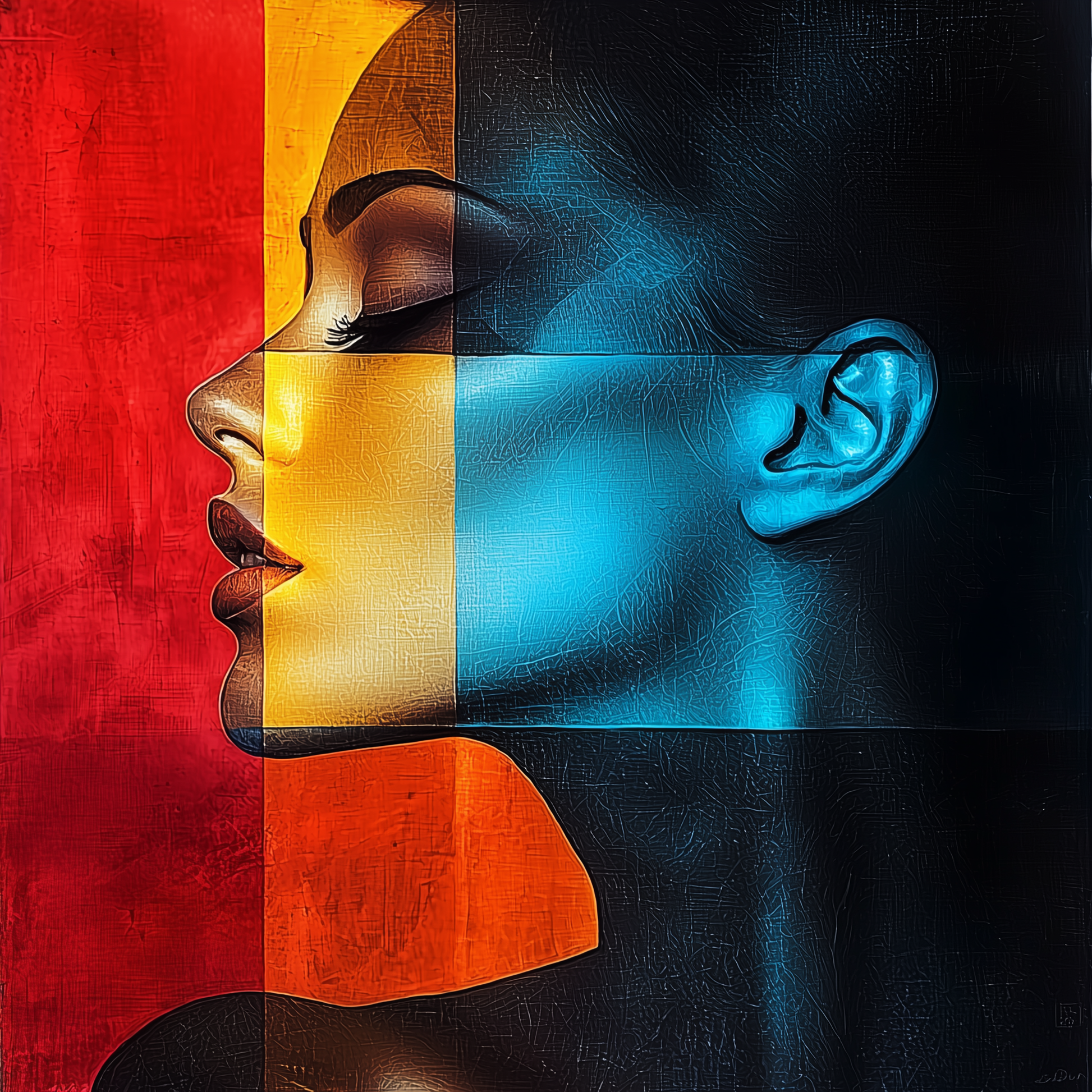 Die intensiven Farbblöcke und die klare Trennung erinnern an popkulturelle Kunstformen, die mit starken Kontrasten arbeiten. -